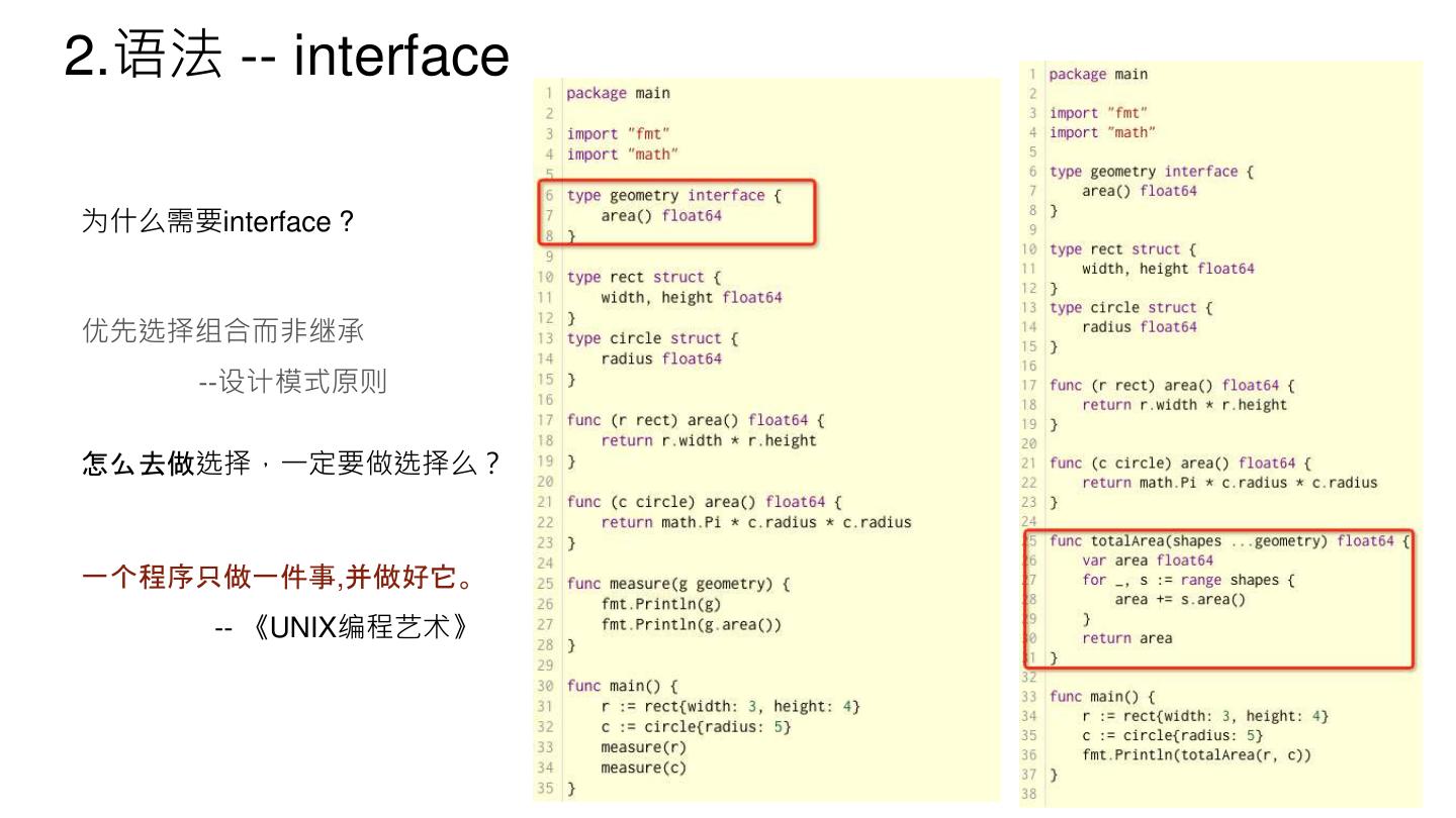 25 .2.语法 -- interface 为什么需要interface ? 优先选择组合而非继承 --设计模式原则 怎么去做选择,一定要做选择么? 一个程序只做一件事,并做好它。 -- 《UNIX编程艺术》