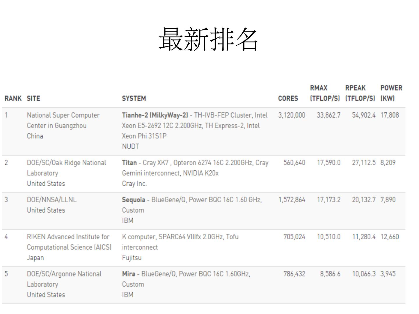 5 .计算阵列 共 16000 个计算节点,每个节点包含两个 Intel Xeon 处理器和三个 MIC 众 核协处理器。共 3120000 个计算核心。 峰值速度( Rpeak )每秒 54,902.4TFLOPS (万亿次浮点运算)(一小时运算次数相当于 13 亿人同时使用计算器计算 1000 年) 持续速度( Rmax ) 33,862.7TFLOPS