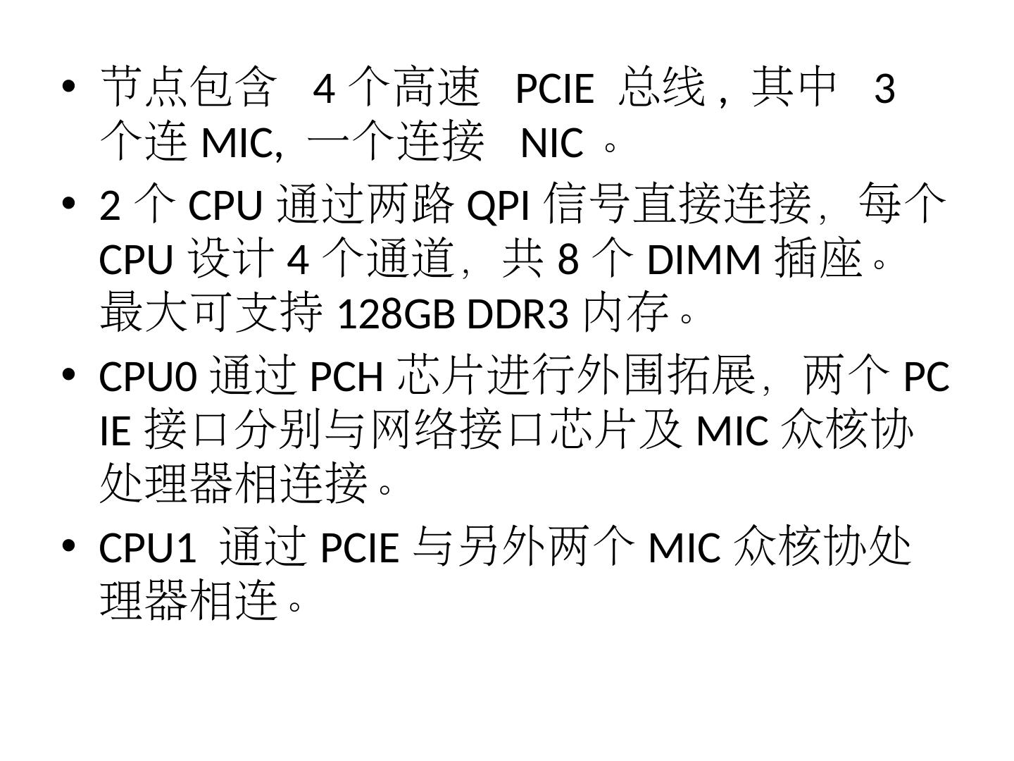 7 .节点包含 4 个高速 PCIE 总线 , 其中 3 个连 MIC, 一个连接 NIC 。 2 个 CPU 通过两路 QPI 信号直接连接,每个 CPU 设计 4 个通道,共 8 个 DIMM 插座。最大可支持 128GB DDR3 内存。 CPU0 通过 PCH 芯片进行外围拓展,两个 PCIE 接口分别与网络接口芯片及 MIC 众核协处理器相连接。 CPU1 通过 PCIE 与另外两个 MIC 众核协处理器相连。
