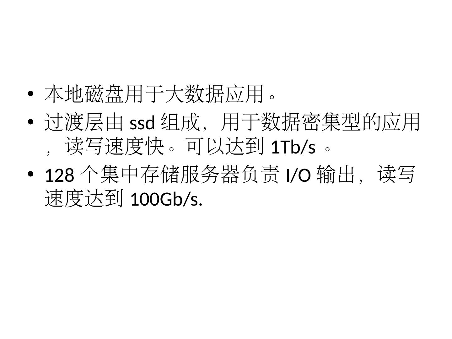 10 .本地磁盘用于大数据应用。 过渡 层由 ssd 组成,用于数据密集型的应用,读写速度快。可以达到 1Tb/s 。 128 个集中存储服务器负责 I/O 输出,读写速度达到 100Gb/s.