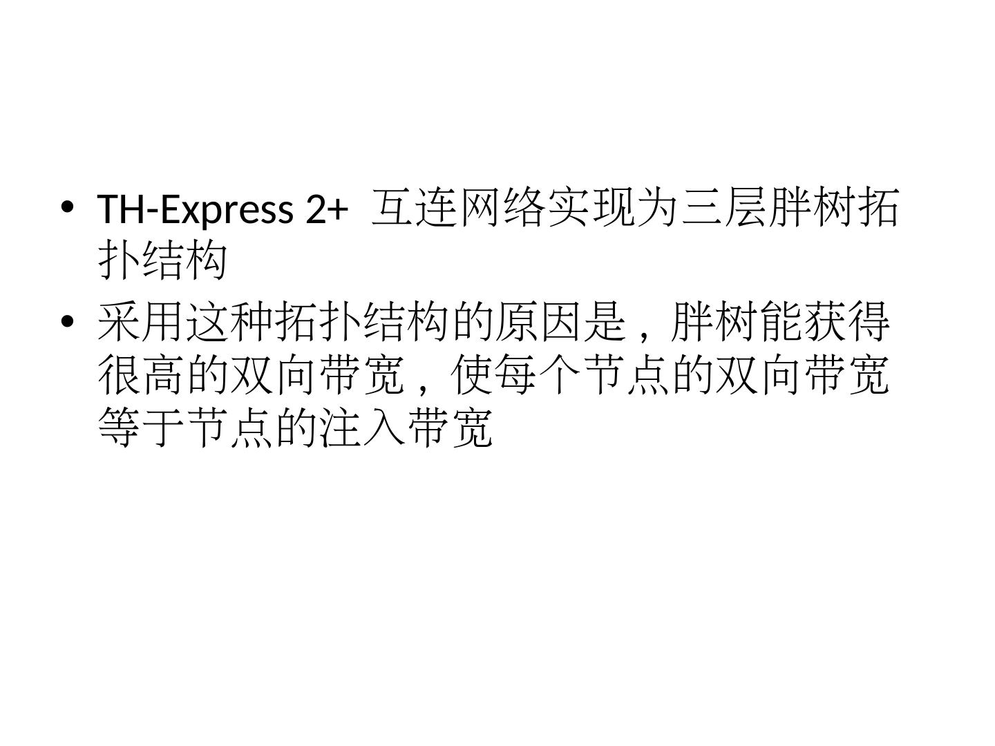 12 .TH-Express 2+ 互连网络实现为三层胖树拓扑结构 采用这种拓扑结构的原因是 , 胖树能获得很高的双向带宽 , 使每个节点的双向带宽等于节点的注入带宽