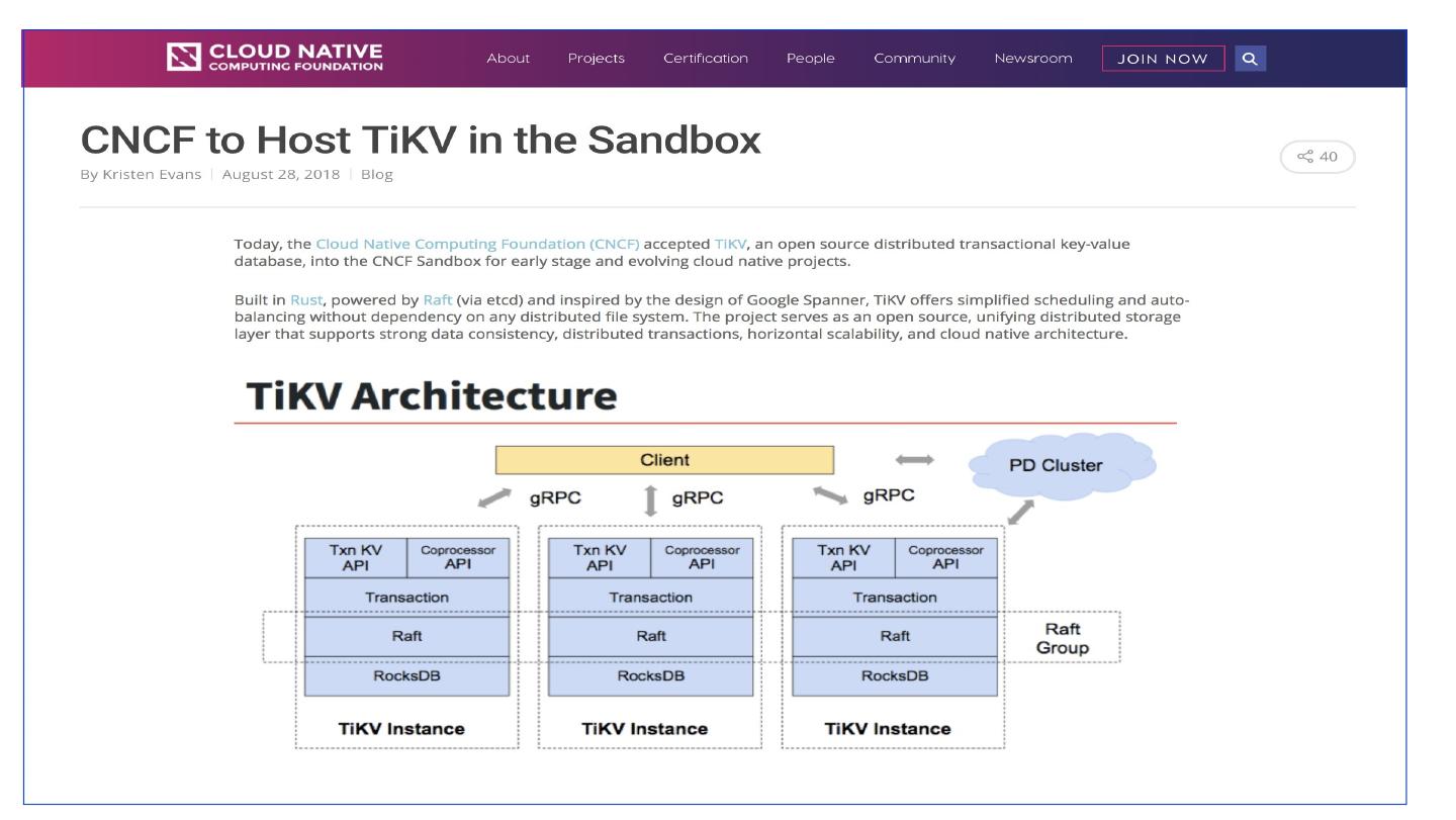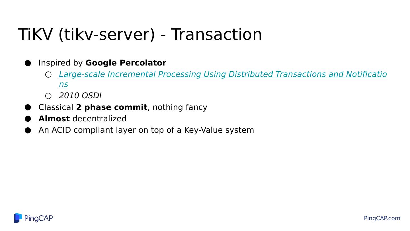 22 .TiKV (tikv-server) - Transaction Inspired by Google Percolator Large-scale Incremental Processing Using Distributed Transactions and Notifications 2010 OSDI Classical 2 phase commit , nothing fancy Almost decentralized An ACID compliant layer on top of a Key-Value system