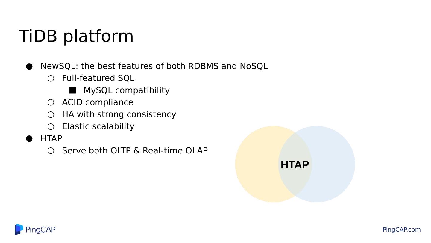 6 .TiDB platform NewSQL: the best features of both RDBMS and NoSQL Full-featured SQL MySQL compatibility ACID compliance HA with strong consistency Elastic scalability HTAP Serve both OLTP & Real-time OLAP HTAP