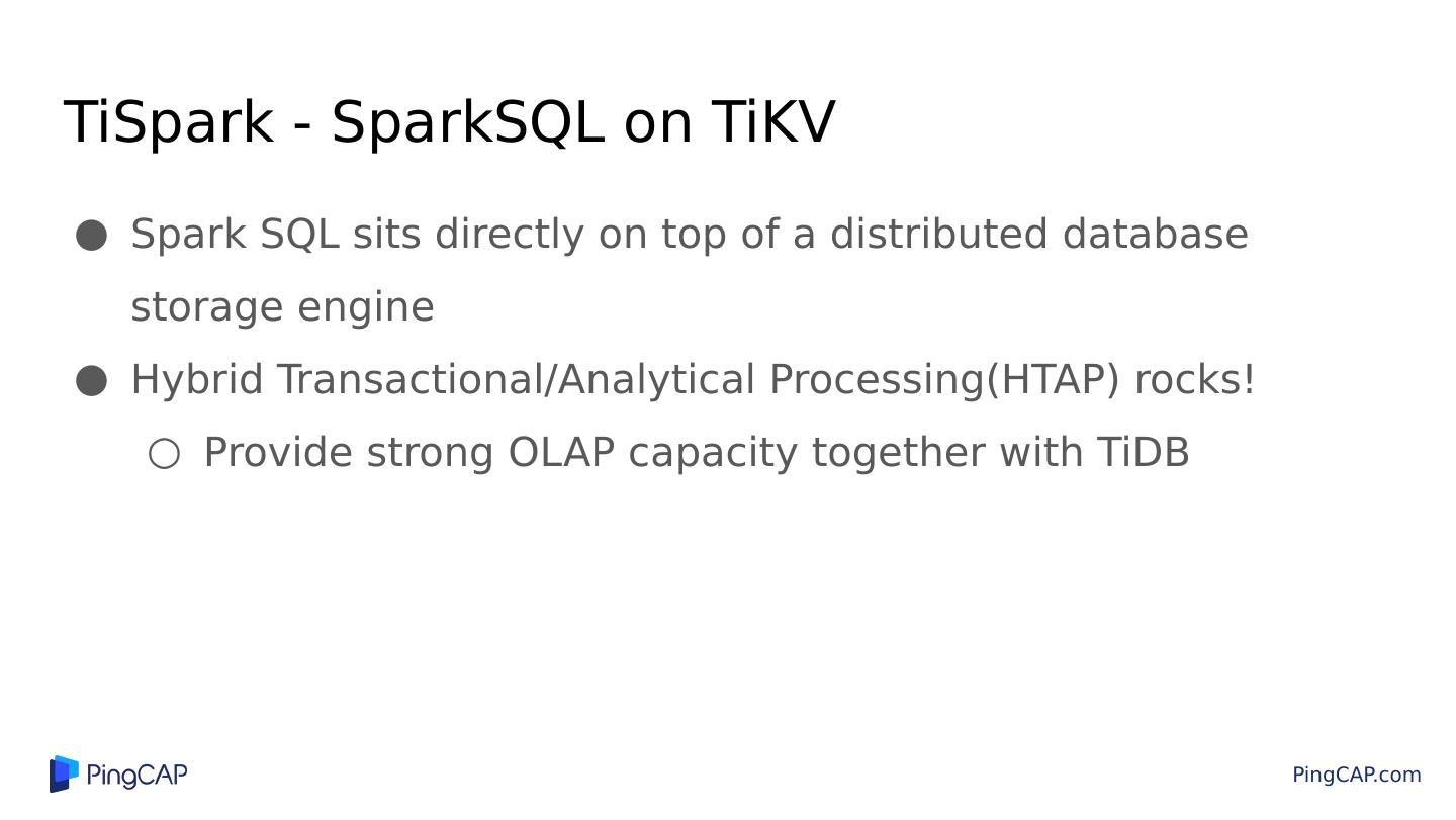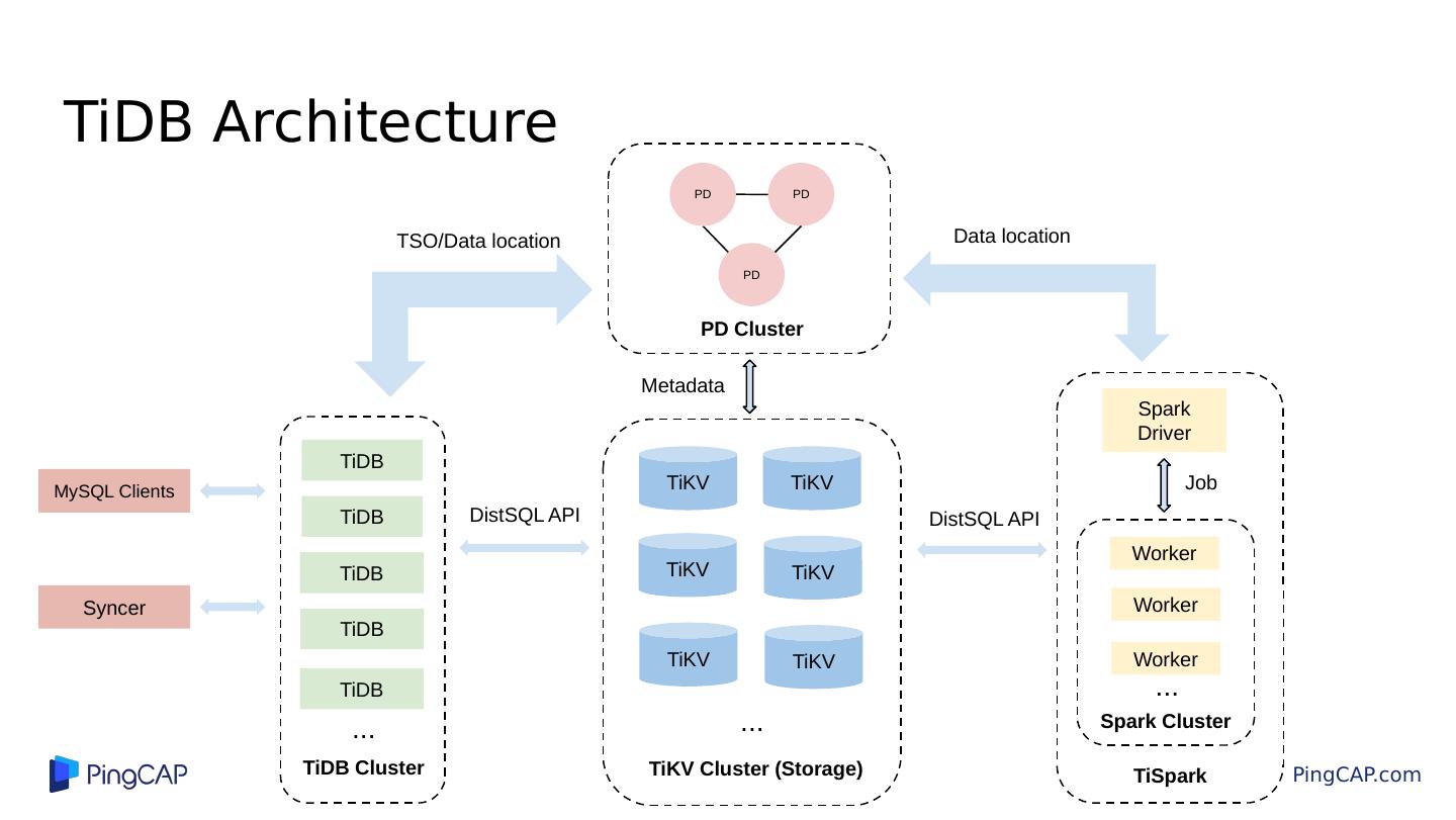 7 .TiDB Architecture TiDB TiDB Worker Spark Driver TiKV Cluster (Storage) Metadata TiKV TiKV TiKV MySQL Clients Syncer Data location Job TiSpark DistSQL API TiKV TiDB TSO/Data location Worker Worker Spark Cluster TiDB Cluster TiDB ... ... ... DistSQL API PD PD PD Cluster TiKV TiKV TiDB PD