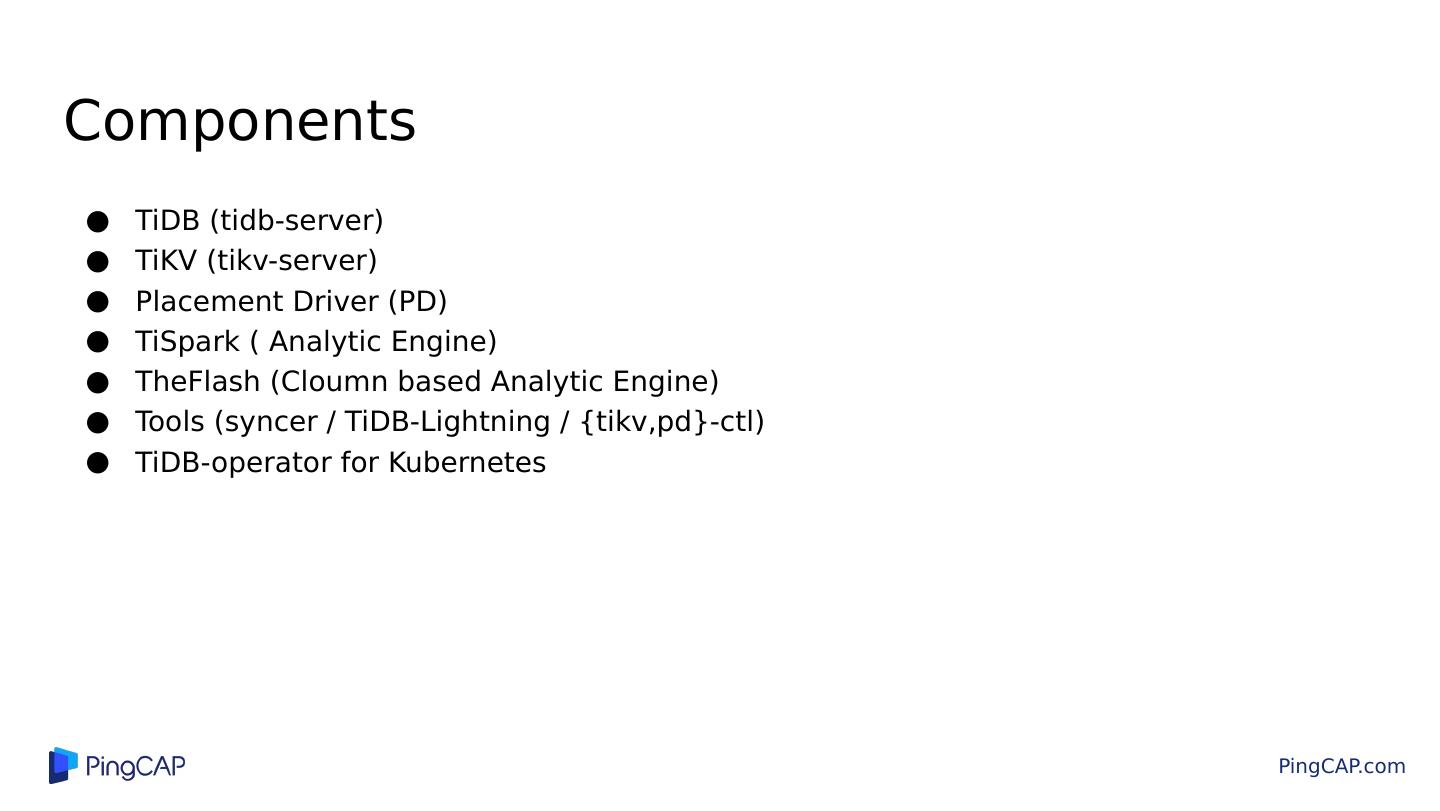 8 .Components TiDB (tidb-server) TiKV (tikv-server) Placement Driver (PD) TiSpark ( Analytic Engine) TheFlash (Cloumn based Analytic Engine) Tools (syncer / TiDB-Lightning / {tikv,pd}-ctl) TiDB-operator for Kubernetes