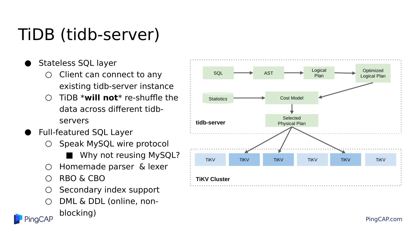 9 .TiDB (tidb-server) Stateless SQL layer Client can connect to any existing tidb-server instance TiDB * will not * re-shuffle the data across different tidb-servers Full-featured SQL Layer Speak MySQL wire protocol Why not reusing MySQL? Homemade parser & lexer RBO & CBO Secondary index support DML & DDL (online, non-blocking) SQL AST Logical Plan Optimized Logical Plan Cost Model Selected Physical Plan TiKV TiKV TiKV tidb-server Statistics TiKV TiKV TiKV TiKV Cluster