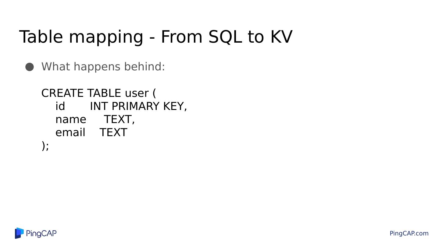 10 .Table mapping - From SQL to KV What happens behind: CREATE TABLE user ( id INT PRIMARY KEY, name TEXT, email TEXT );