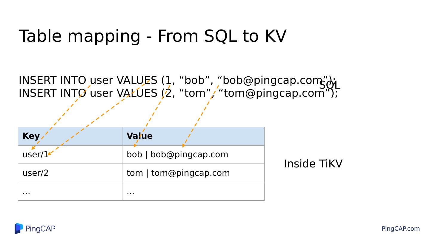 11 .Table mapping - From SQL to KV Key Value user/1 bob | bob@pingcap.com user/2 tom | tom@pingcap.com ... ... INSERT INTO user VALUES (1, “bob”, “bob@pingcap.com”); INSERT INTO user VALUES (2, “tom”, “tom@pingcap.com”); Inside TiKV SQL
