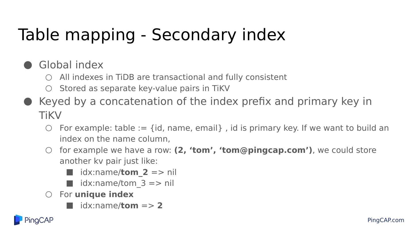 12 .Table mapping - Secondary index Global index All indexes in TiDB are transactional and fully consistent Stored as separate key-value pairs in TiKV Keyed by a concatenation of the index prefix and primary key in TiKV For example: table := {id, name, email} , id is primary key. If we want to build an index on the name column, for example we have a row: (2, ‘tom’, ‘tom@pingcap.com’) , we could store another kv pair just like: idx:name/ tom_2 => nil idx:name/tom_3 => nil For unique index idx:name/ tom => 2