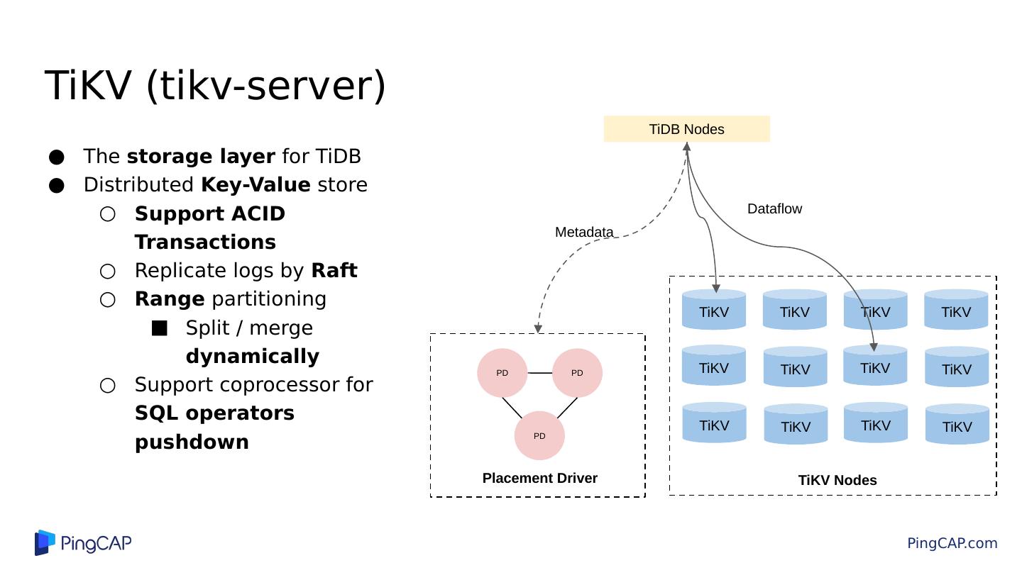 13 .TiKV (tikv-server) The storage layer for TiDB Distributed Key-Value store Support ACID Transactions Replicate logs by Raft Range partitioning Split / merge dynamically Support coprocessor for SQL operators pushdown TiKV TiKV TiKV TiKV TiKV TiKV PD PD PD Placement Driver TiKV TiKV TiKV TiKV TiKV TiKV TiKV Nodes TiDB Nodes Metadata Dataflow