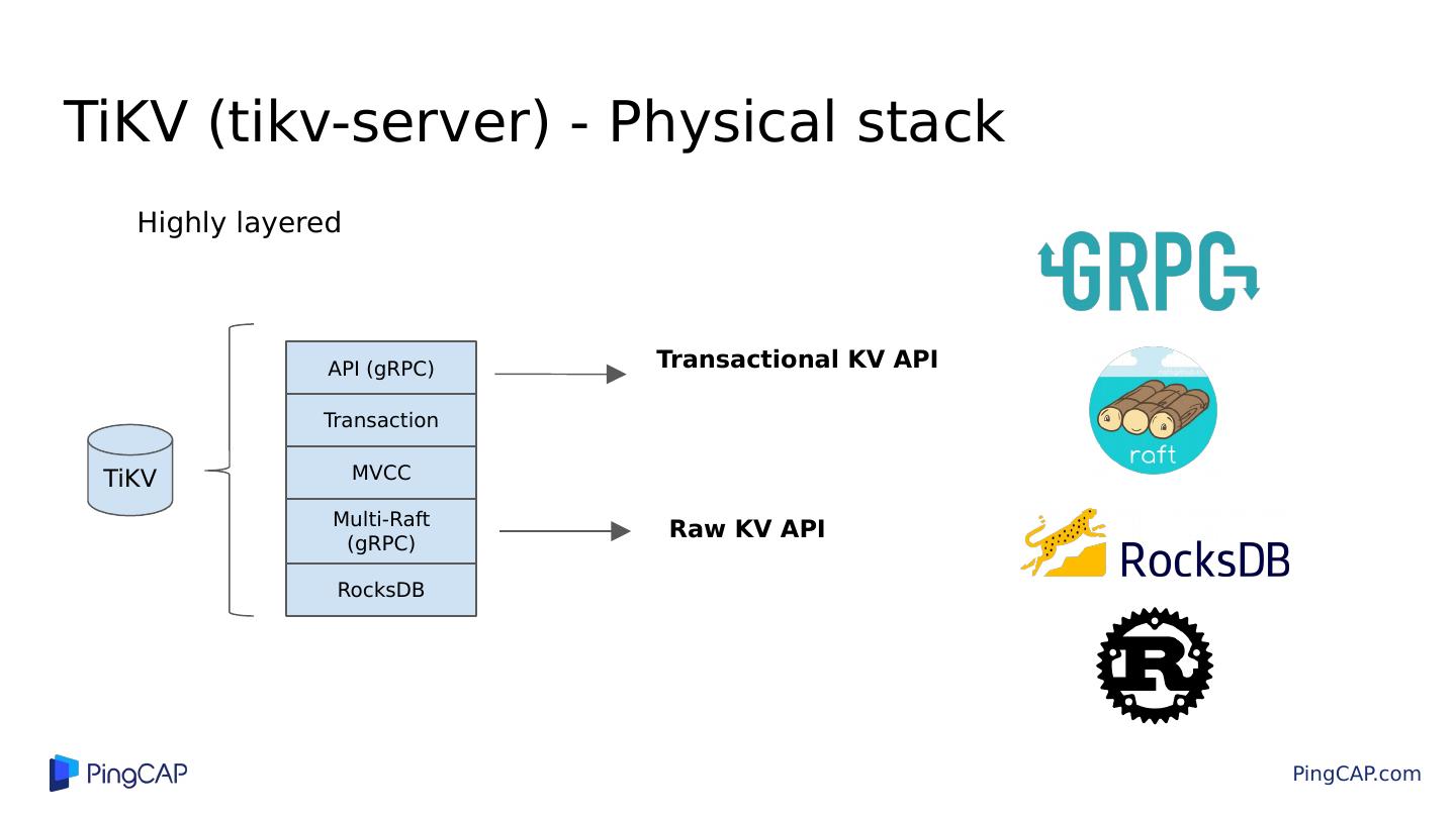 14 .TiKV (tikv-server) - Physical stack Highly layered TiKV API (gRPC) Transaction MVCC Multi- Raft (gRPC) RocksDB Raw KV API Transactional KV API