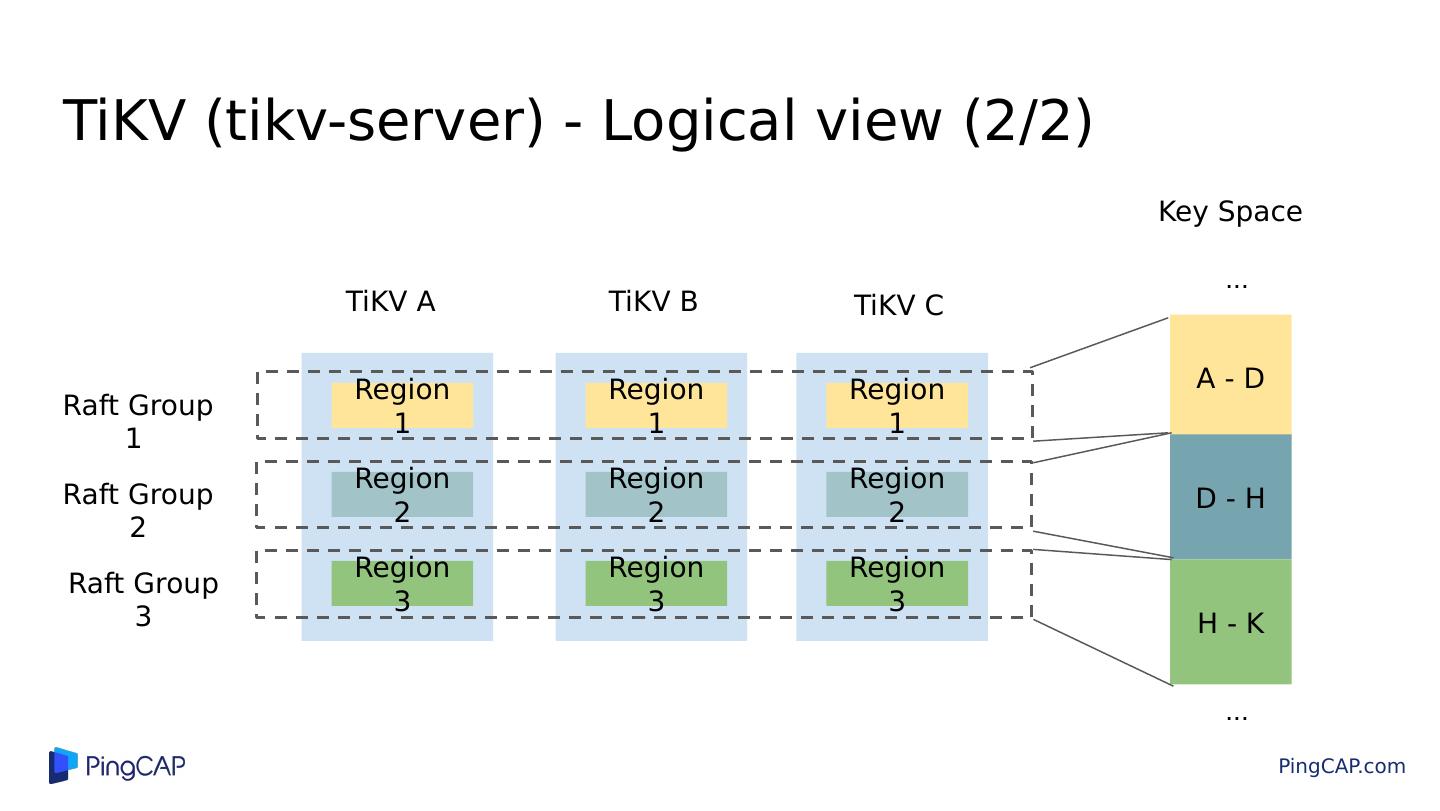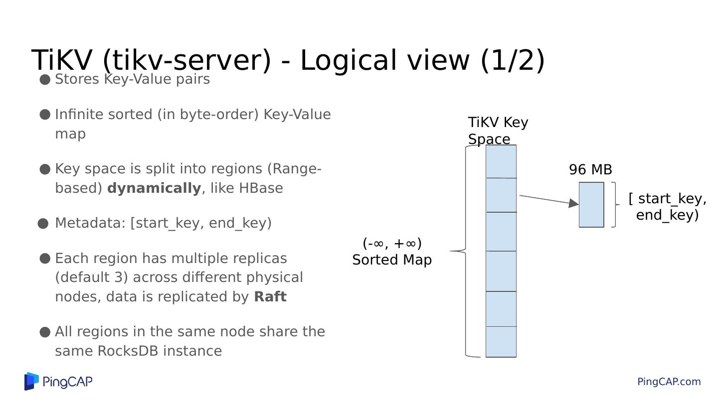 15 .TiKV (tikv-server) - Logical view (1/2) Stores Key-Value pairs Infinite sorted (in byte-order) Key-Value map Key space is split into regions (Range-based) dynamically , like HBase Metadata: [start_key, end_key) Each region has multiple replicas (default 3) across different physical nodes, data is replicated by Raft All regions in the same node share the same RocksDB instance TiKV Key Space [ start_key, end_key) (-∞, +∞) Sorted Map 96 MB
