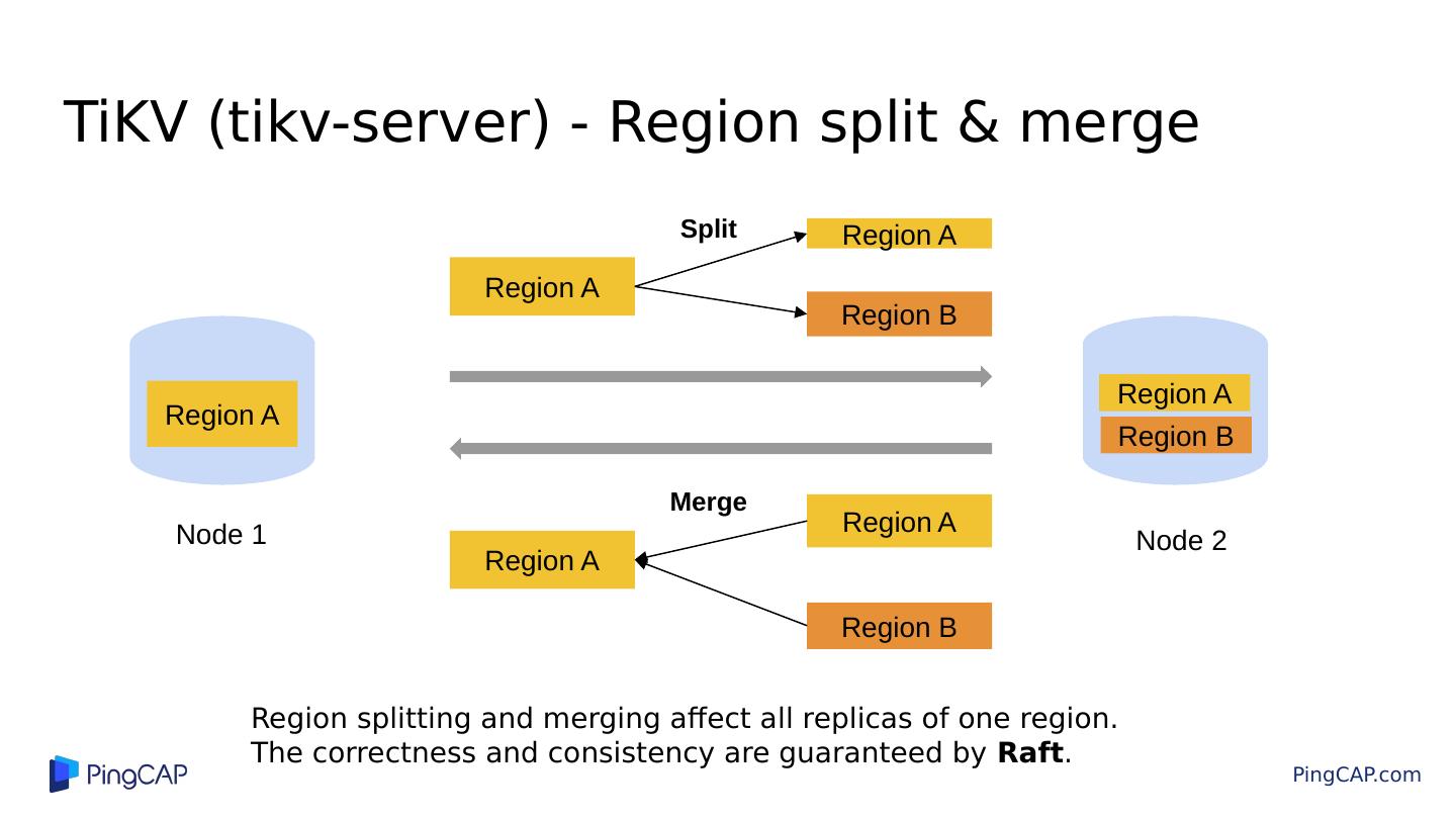 17 .TiKV (tikv-server) - Region split & merge Region A Region A Region B Region A Region A Region B Split Region A Region A Region B Merge Node 2 Node 1 Region splitting and merging affect all replicas of one region. The correctness and consistency are guaranteed by Raft .