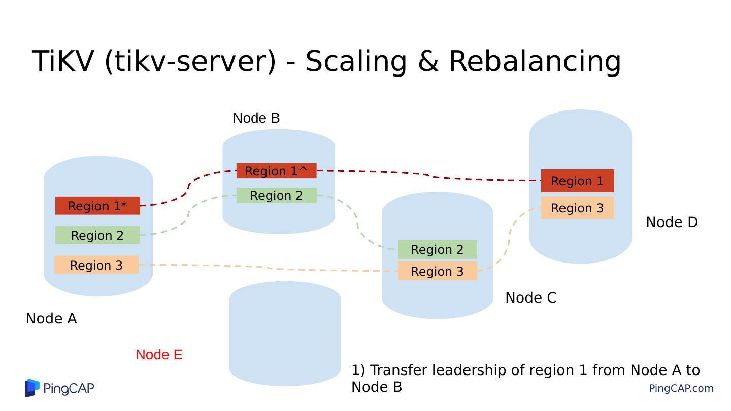19 .TiKV (tikv-server) - Scaling & Rebalancing Region 1 Region 3 Region 1^ Region 2 Region 1* Region 2 Region 2 Region 3 Region 3 Node A Node B Node E 1) Transfer leadership of region 1 from Node A to Node B Node C Node D