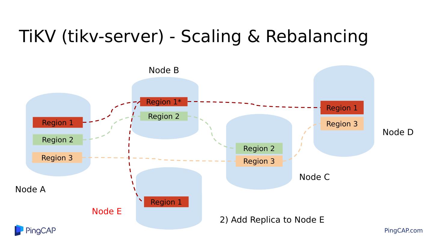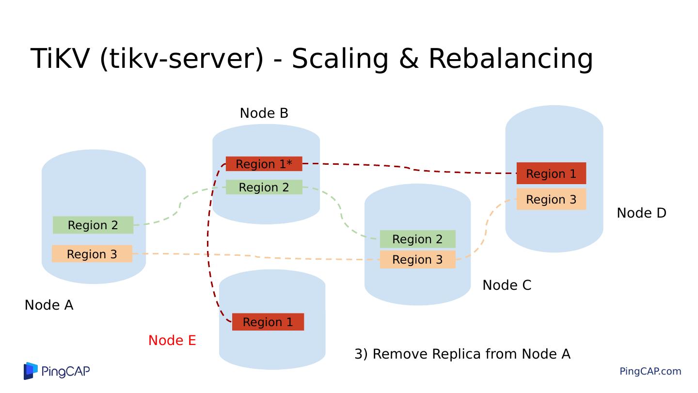 20 .TiKV (tikv-server) - Scaling & Rebalancing Region 1 Region 3 Region 1* Region 2 Region 2 Region 2 Region 3 Region 1 Region 3 Node A Node B 2) Add Replica to Node E Node C Node D Node E Region 1