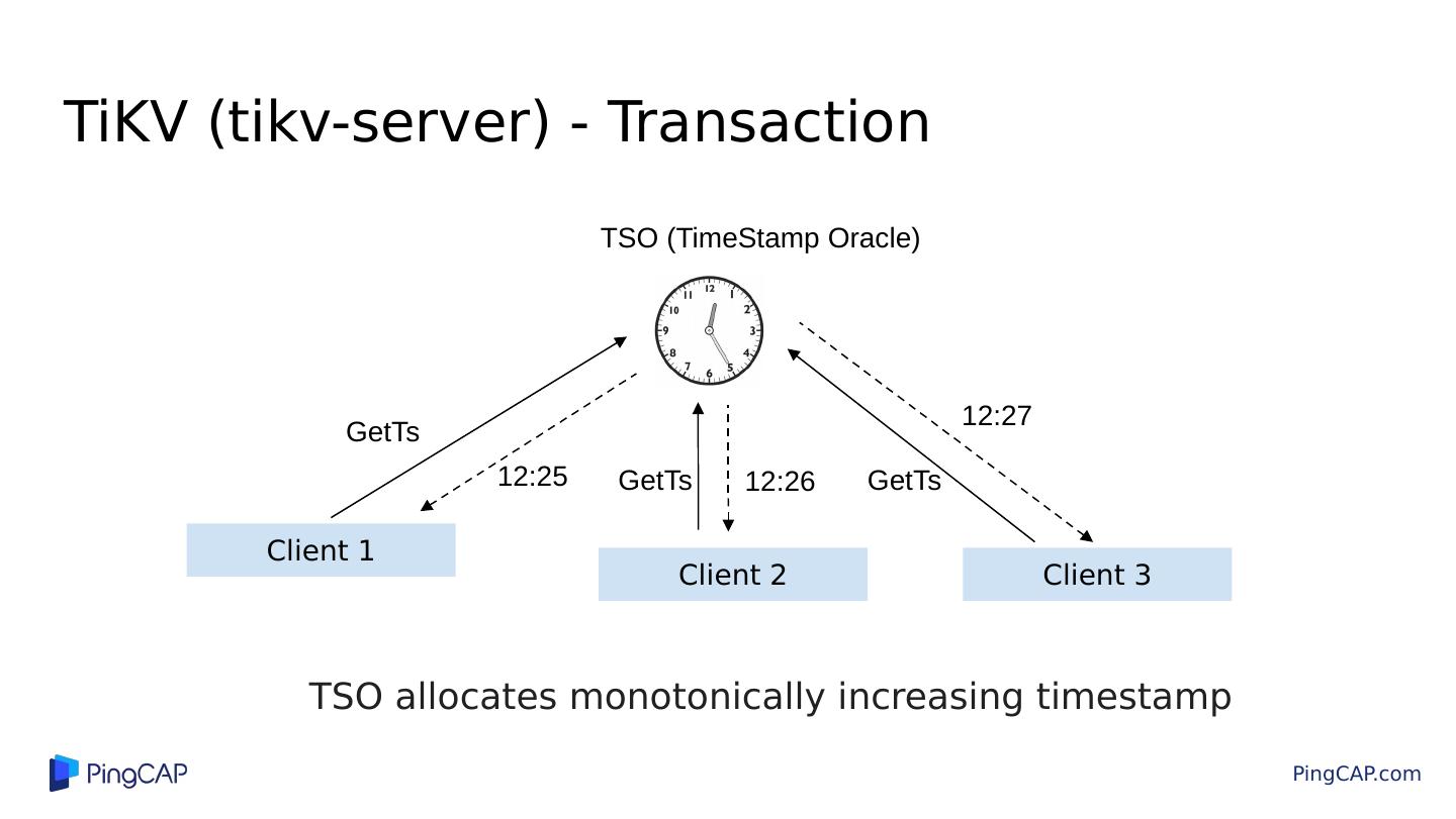 23 .TiKV (tikv-server) - Transaction Client 1 Client 2 Client 3 GetTs 12:25 12:26 12:27 GetTs GetTs TSO (TimeStamp Oracle) TSO allocates monotonically increasing timestamp