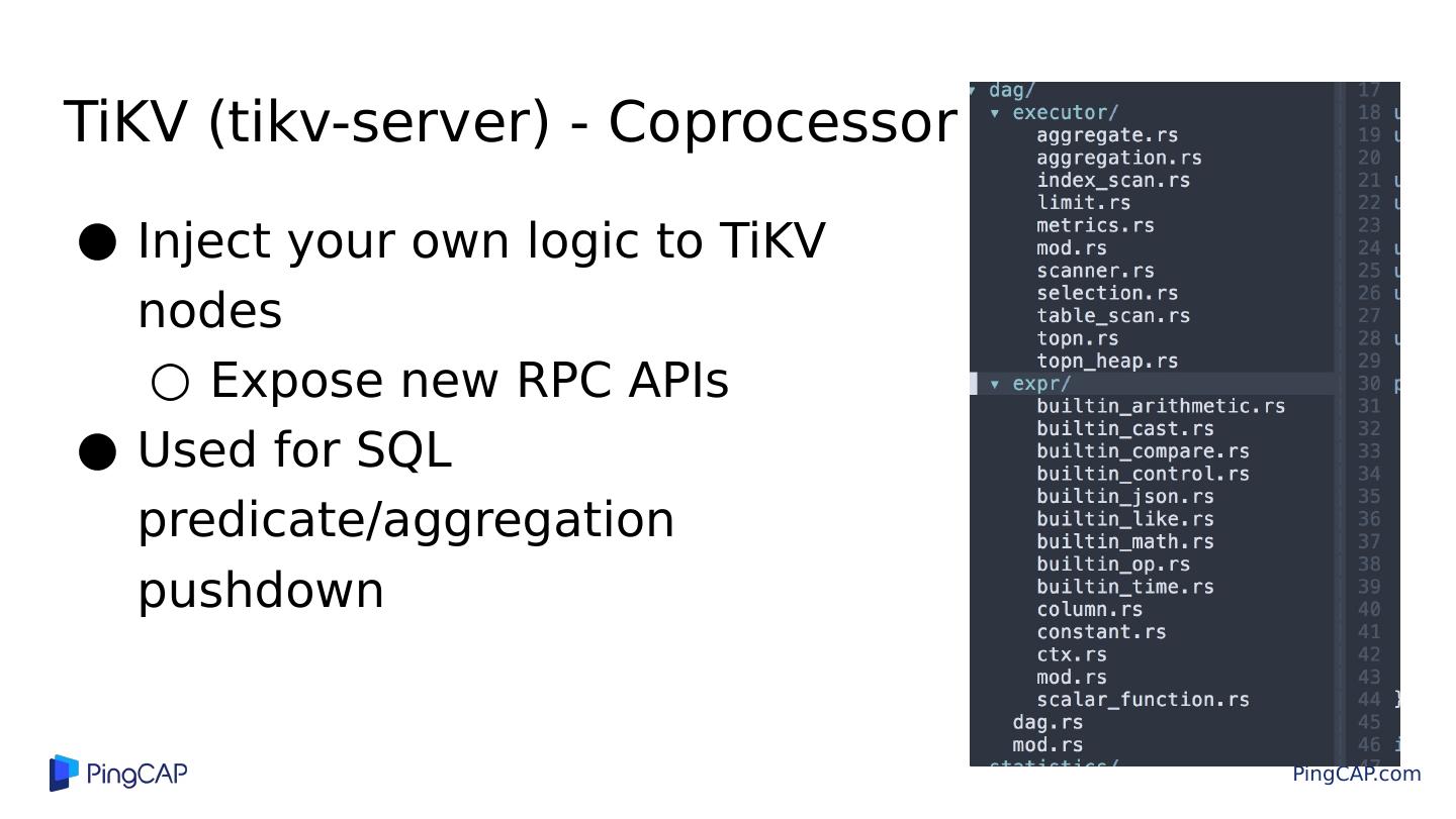 24 .Inject your own logic to TiKV nodes Expose new RPC APIs Used for SQL predicate/aggregation pushdown TiKV (tikv-server) - Coprocessor