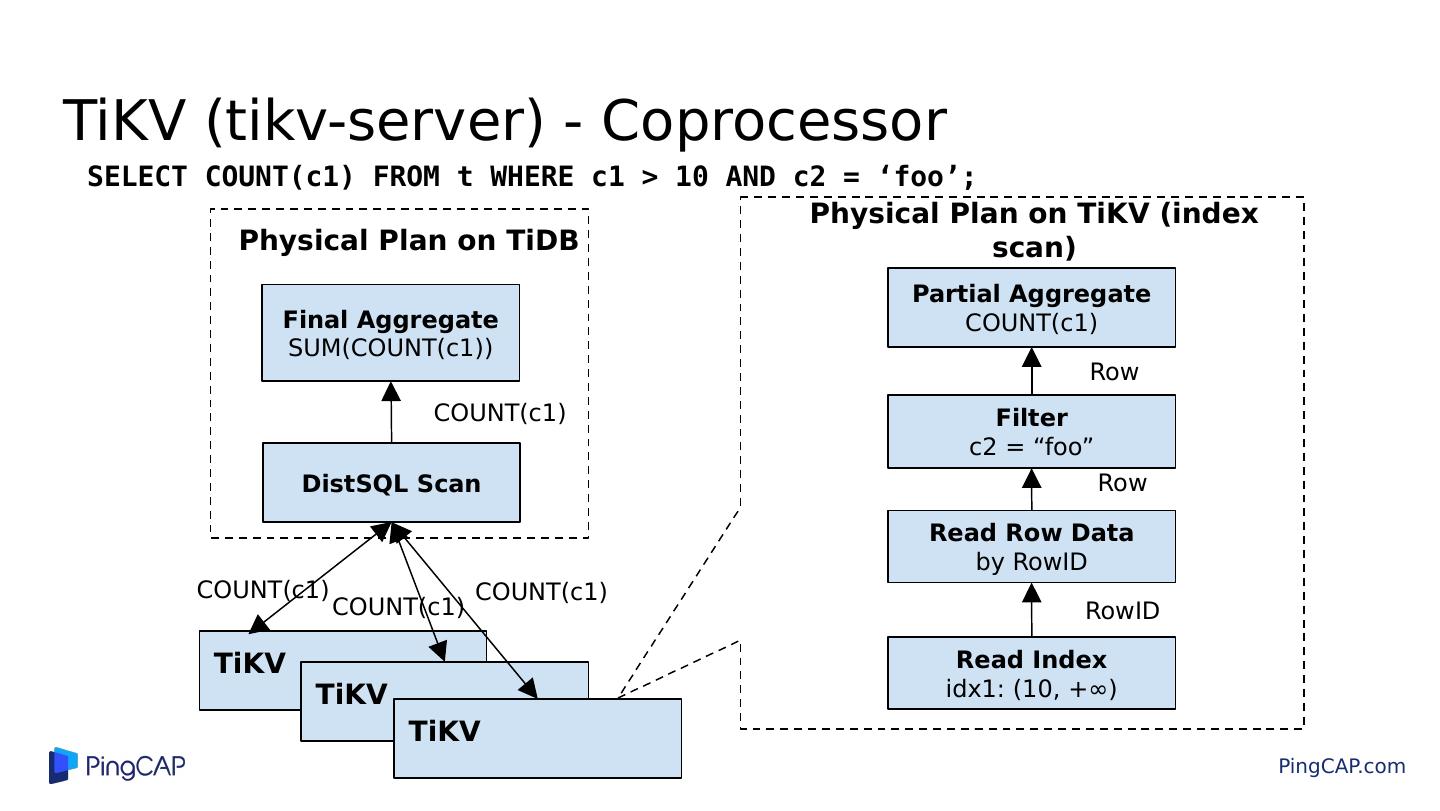 25 .TiKV (tikv-server) - Coprocessor Partial Aggregate COUNT(c1) Filter c2 = “ foo ” Read Index idx1: (10, +∞) Physical Plan on TiKV (index scan) Read Row Data by RowID RowID Row Row Final Aggregate SUM(COUNT(c1)) DistSQL Scan Physical Plan on TiDB COUNT(c1) COUNT(c1) TiKV TiKV TiKV COUNT(c1) COUNT(c1) SELECT COUNT(c1) FROM t WHERE c1 > 10 AND c2 = ‘foo’ ;