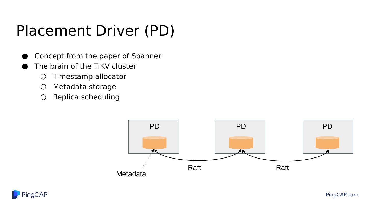 26 .Placement Driver (PD) Concept from the paper of Spanner The brain of the TiKV cluster Timestamp allocator Metadata storage Replica scheduling PD PD PD Raft Raft Metadata