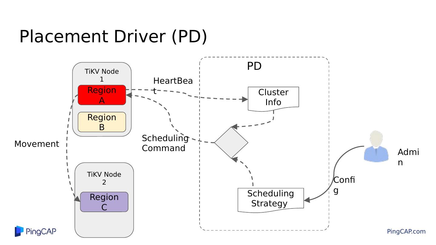 27 .Placement Driver (PD) Region A Region B TiKV Node 1 TiKV Node 2 PD Scheduling Strategy Cluster Info Admin HeartBeat Scheduling Command Region C Config Movement