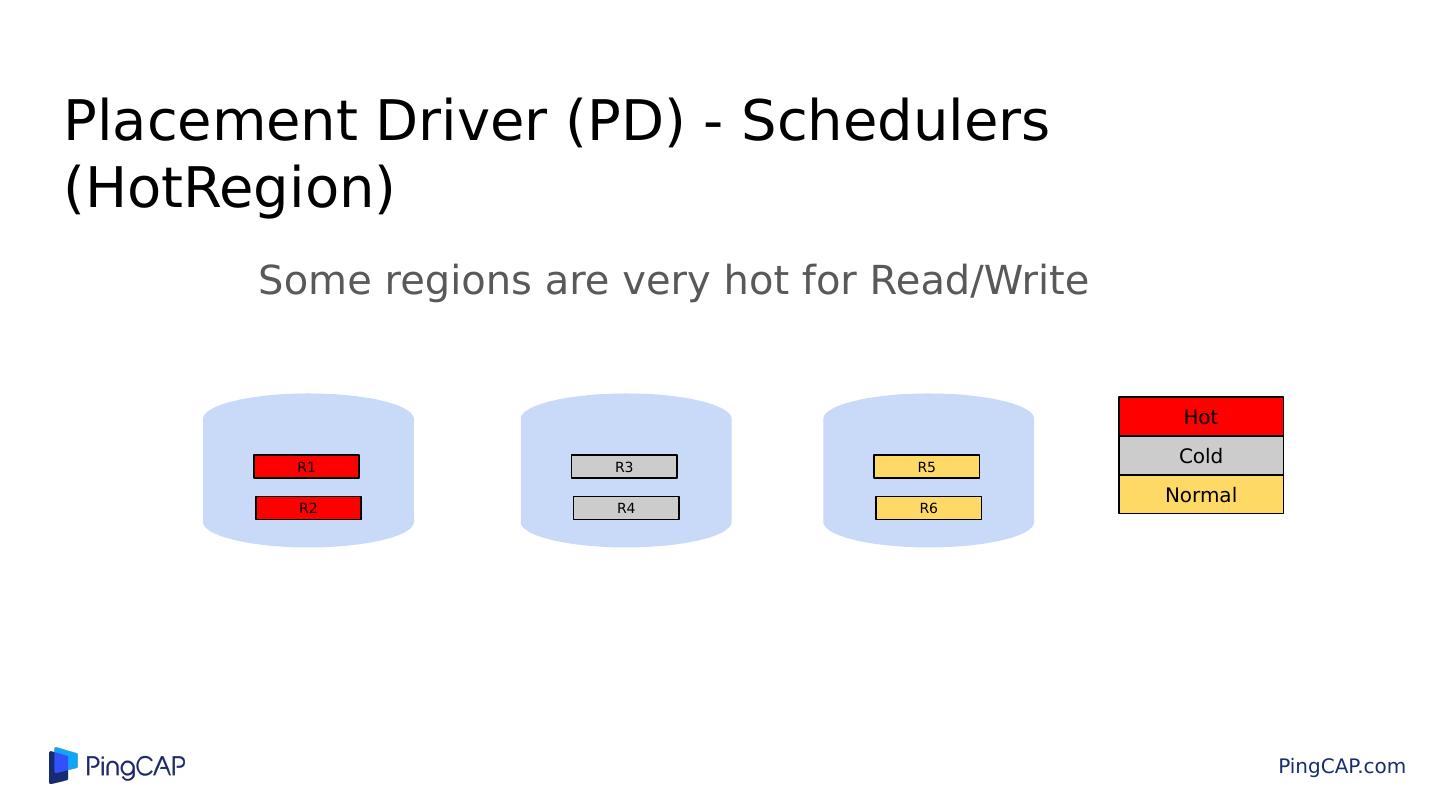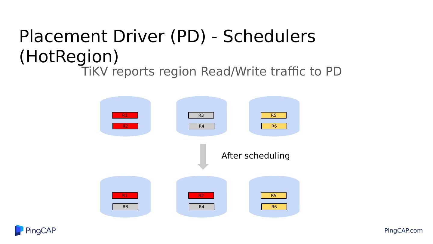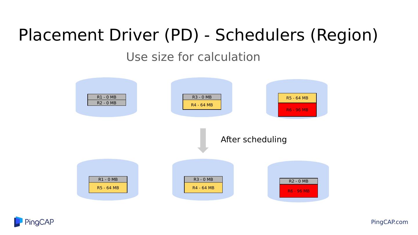 29 .Placement Driver (PD) - Schedulers (Region) Use size for calculation R1 - 0 MB R2 - 0 MB R3 - 0 MB R4 - 64 MB R5 - 64 MB R6 - 96 MB R1 - 0 MB R5 - 64 MB R3 - 0 MB R4 - 64 MB R2 - 0 MB R6 - 96 MB After scheduling
