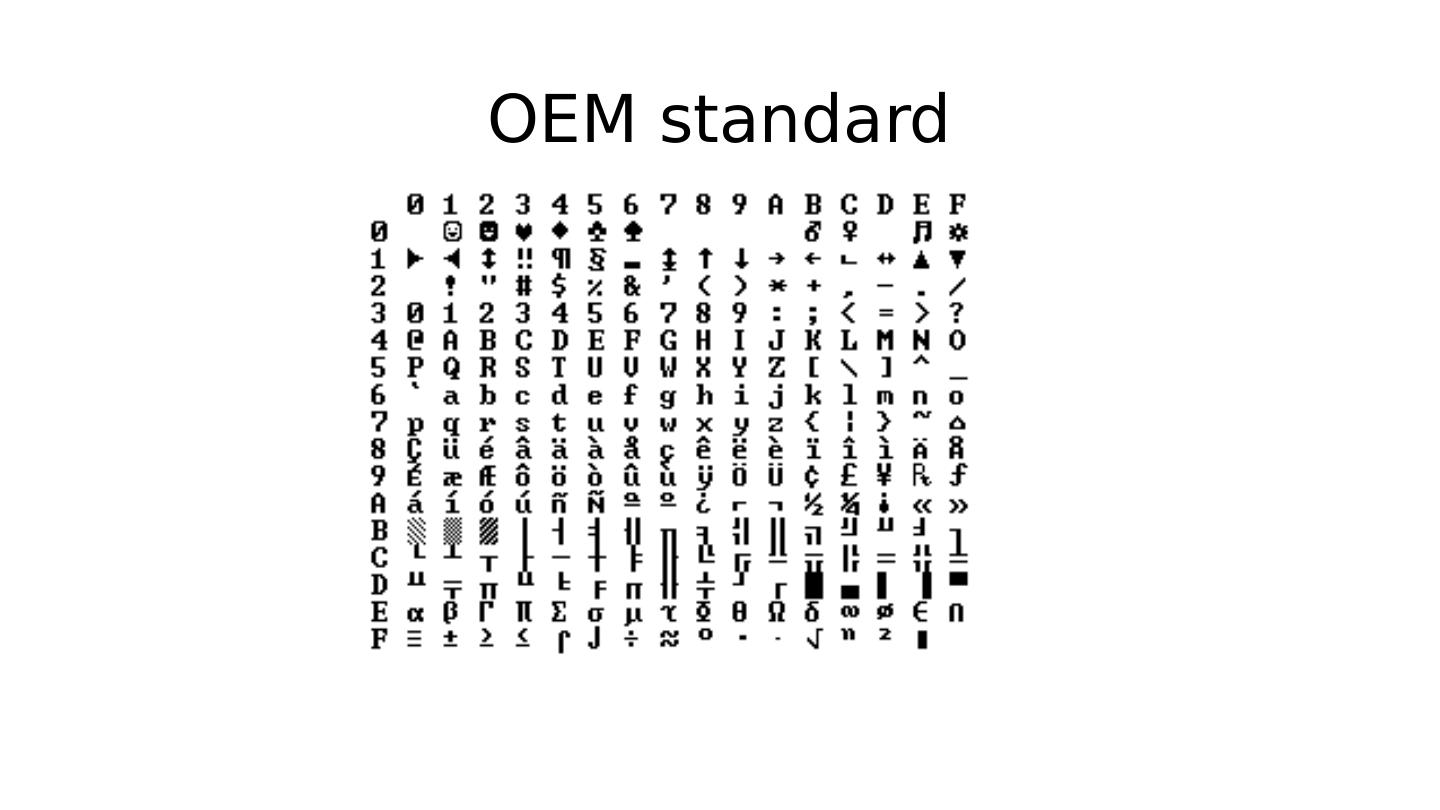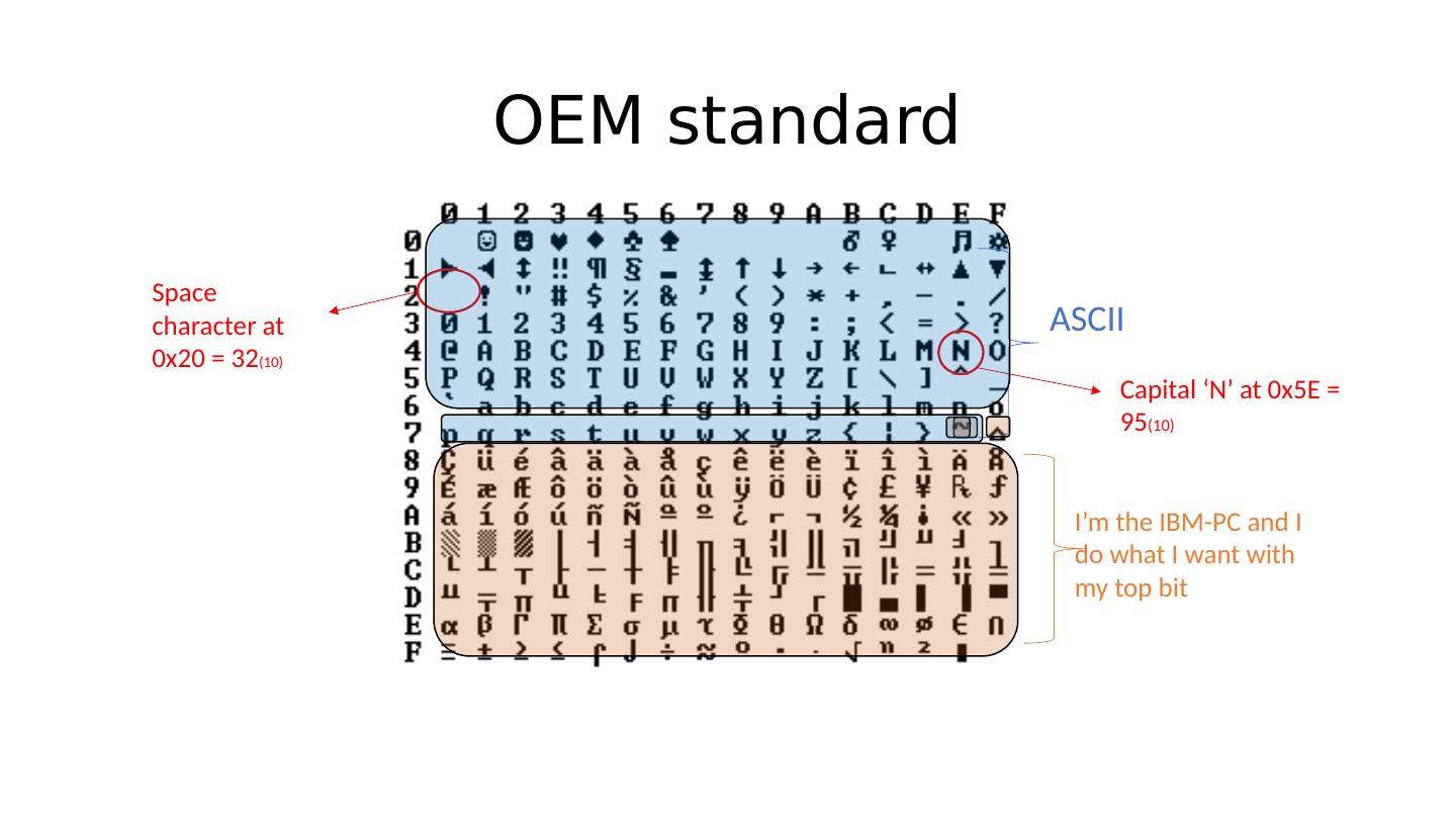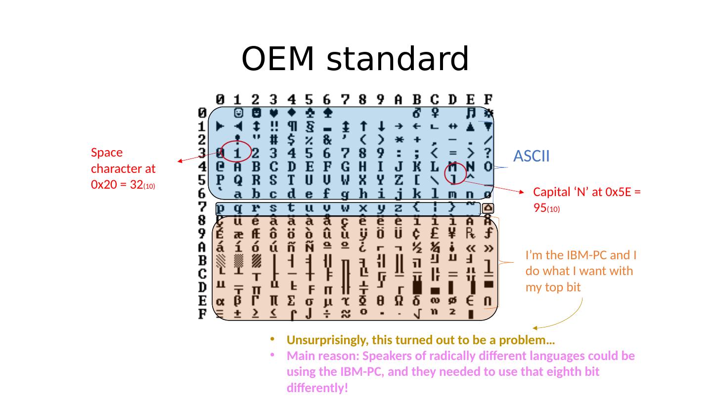 8 .OEM standard ASCII Space character at 0x20 = 32 (10) Capital ‘N’ at 0x5E = 95 (10) Unsurprisingly, this turned out to be a problem… Main reason: Speakers of radically different languages could be using the IBM-PC, and they needed to use that eighth bit differently! I’m the IBM-PC and I do what I want with my top bit