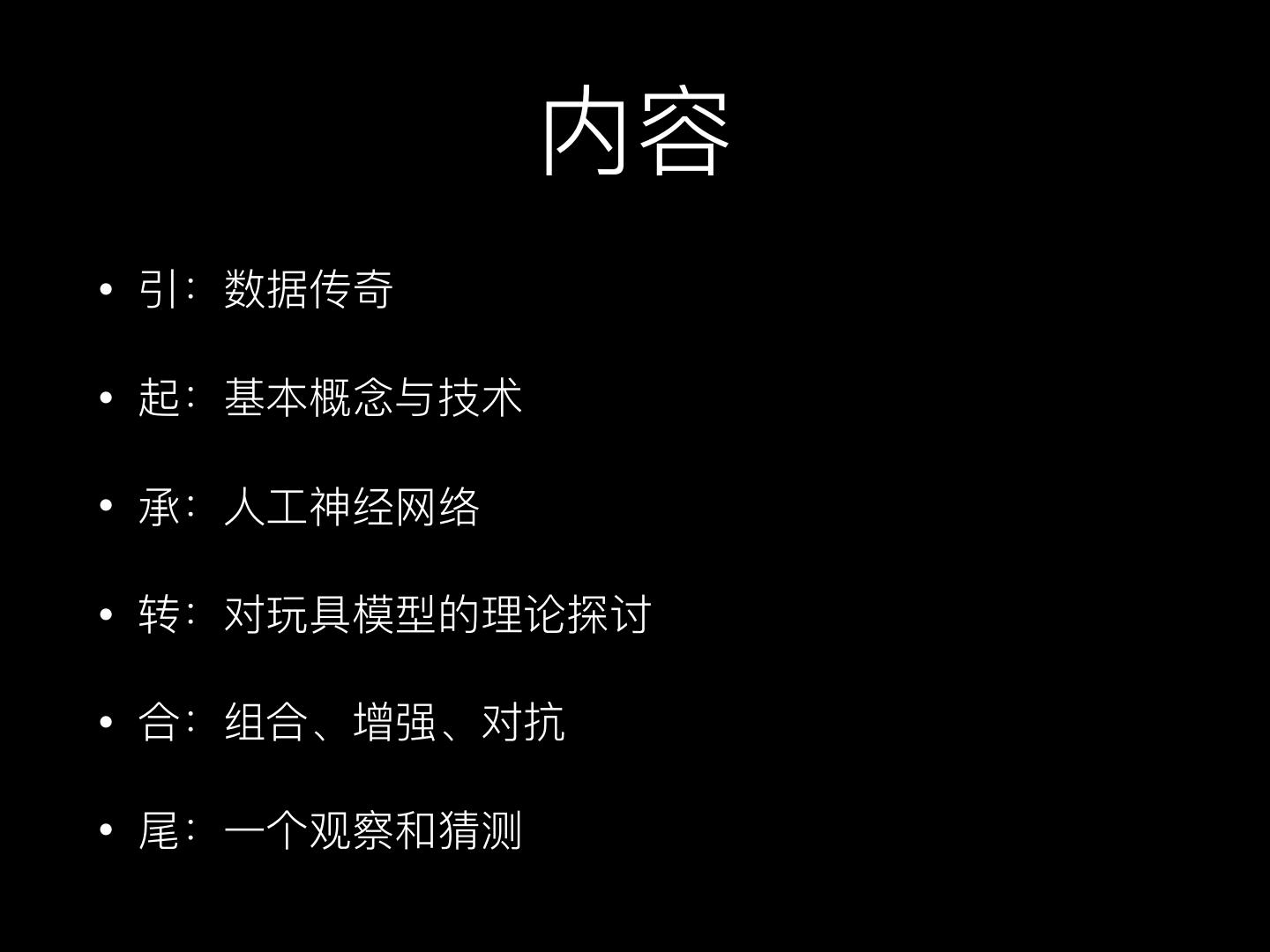 2 . 内容 • 引:数据传奇 • 起:基本概念与技术 • 承:⼈人⼯工神经⽹网络 • 转:对玩具模型的理理论探讨 • 合:组合、增强、对抗 • 尾:⼀一个观察和猜测