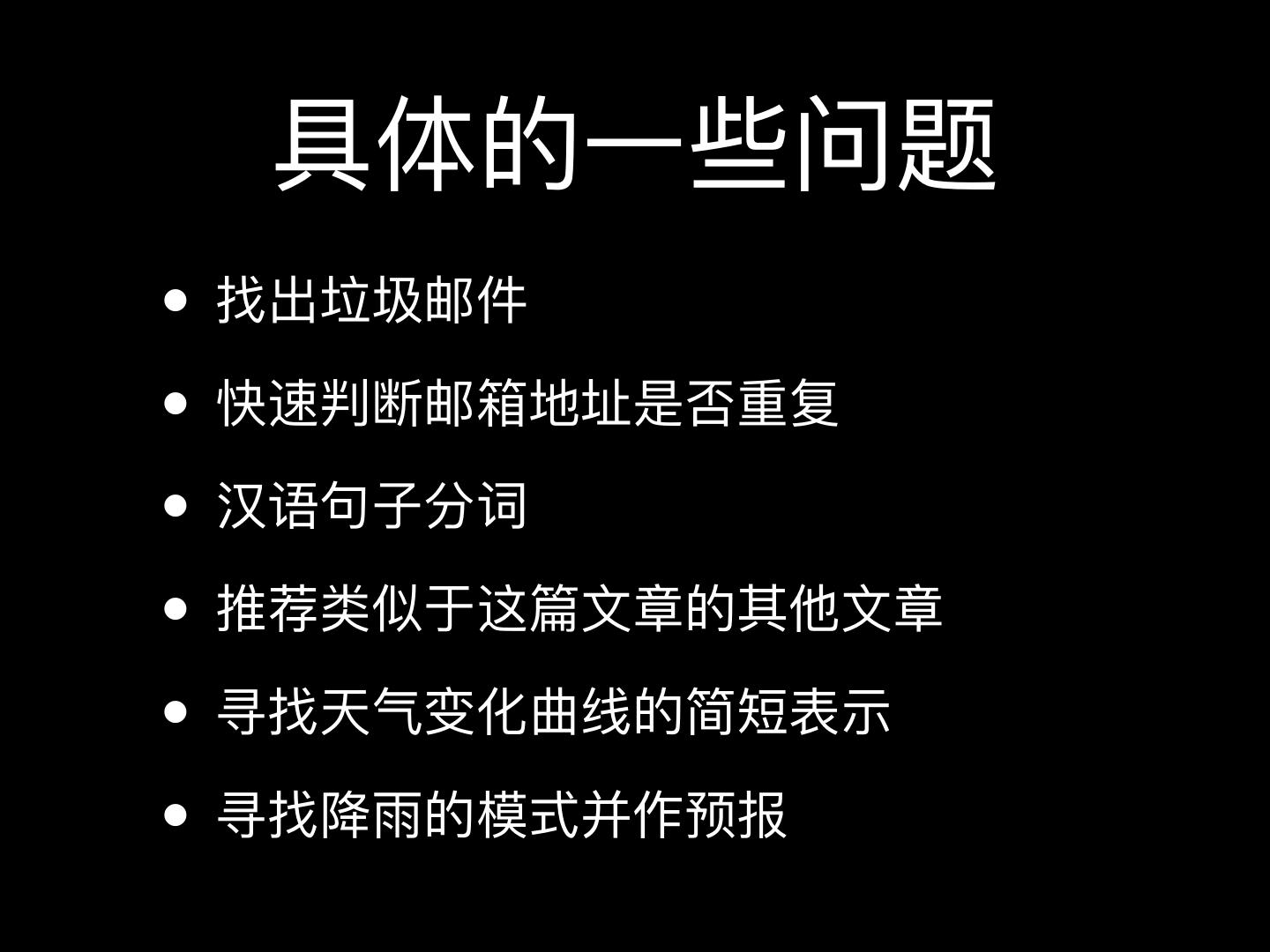 13 . 具体的⼀一些问题 • 找出垃圾邮件 • 快速判断邮箱地址是否重复 • 汉语句句⼦子分词 • 推荐类似于这篇⽂文章的其他⽂文章 • 寻找天⽓气变化曲线的简短表示 • 寻找降⾬雨的模式并作预报