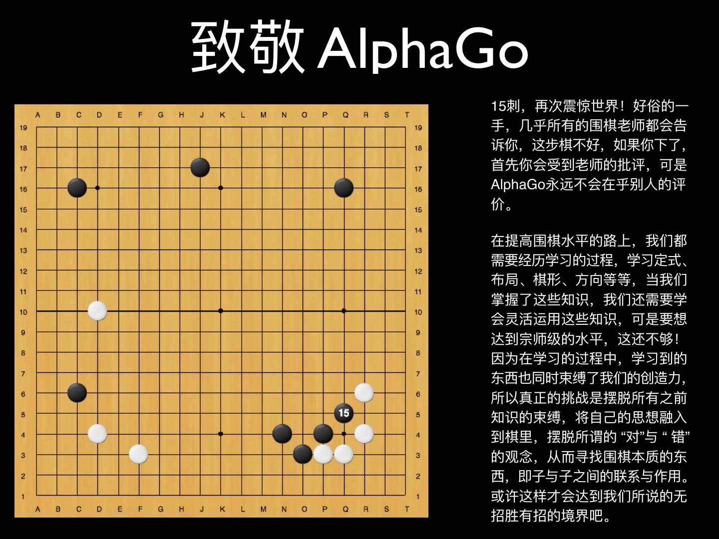 20 .致敬 AlphaGo 15刺刺,再次震惊世界!好俗的⼀一 ⼿手,⼏几乎所有的围棋⽼老老师都会告 诉你,这步棋不不好,如果你下了了, ⾸首先你会受到⽼老老师的批评,可是 AlphaGo永远不不会在乎别⼈人的评 价。 在提⾼高围棋⽔水平的路路上,我们都 需要经历学习的过程,学习定式、 布局、棋形、⽅方向等等,当我们 掌握了了这些知识,我们还需要学 会灵活运⽤用这些知识,可是要想 达到宗师级的⽔水平,这还不不够! 因为在学习的过程中,学习到的 东⻄西也同时束缚了了我们的创造⼒力力, 所以真正的挑战是摆脱所有之前 知识的束缚,将⾃自⼰己的思想融⼊入 到棋⾥里里,摆脱所谓的 “对”与 “ 错” 的观念,从⽽而寻找围棋本质的东 ⻄西,即⼦子与⼦子之间的联系与作⽤用。 或许这样才会达到我们所说的⽆无 招胜有招的境界吧。