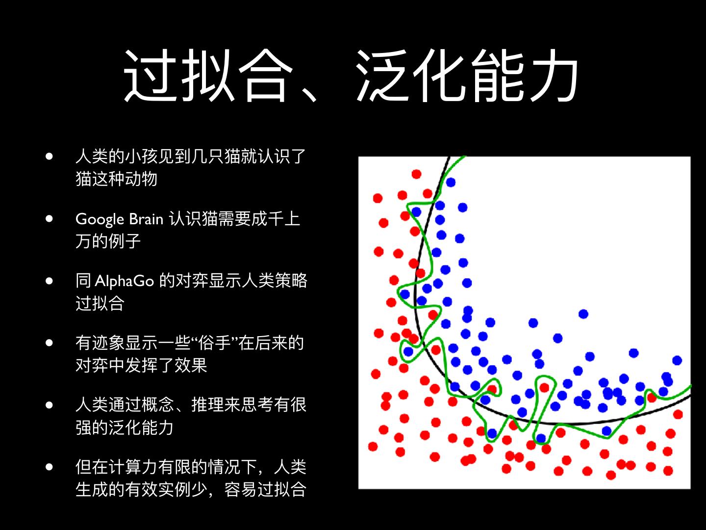 21 . 过拟合、泛化能⼒力力 • ⼈人类的⼩小孩⻅见到⼏几只猫就认识了了 猫这种动物 • Google Brain 认识猫需要成千上 万的例例⼦子 • 同 AlphaGo 的对弈显示⼈人类策略略 过拟合 • 有迹象显示⼀一些“俗⼿手”在后来的 对弈中发挥了了效果 • ⼈人类通过概念、推理理来思考有很 强的泛化能⼒力力 • 但在计算⼒力力有限的情况下,⼈人类 ⽣生成的有效实例例少,容易易过拟合