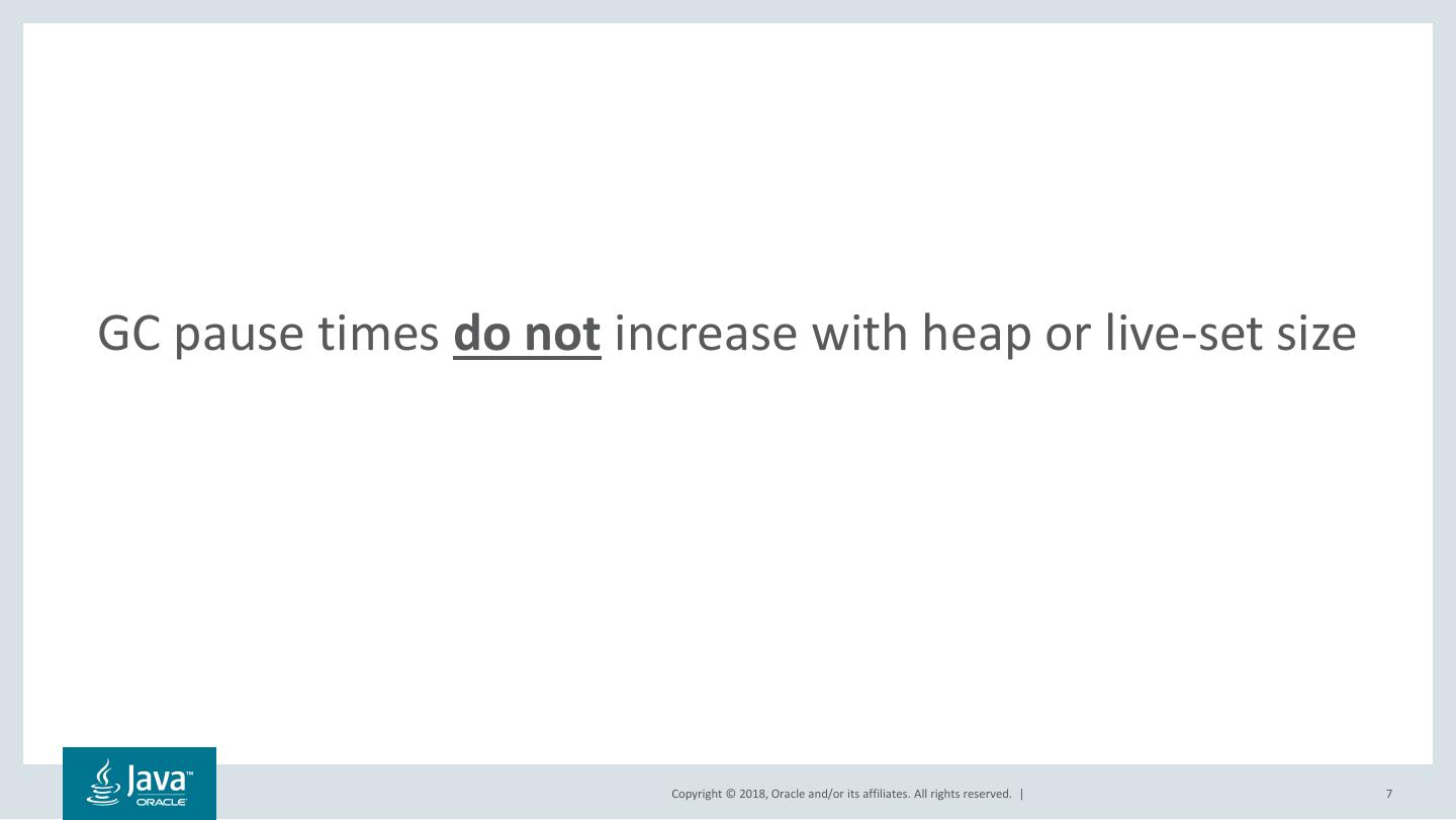 7 .GC pause times do not increase with heap or live-set size Copyright © 2018, Oracle and/or its affiliates. All rights reserved. | 7