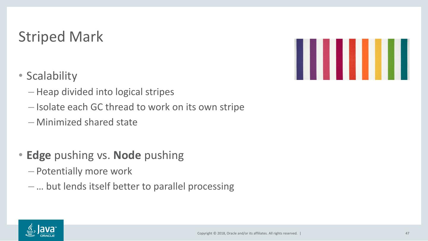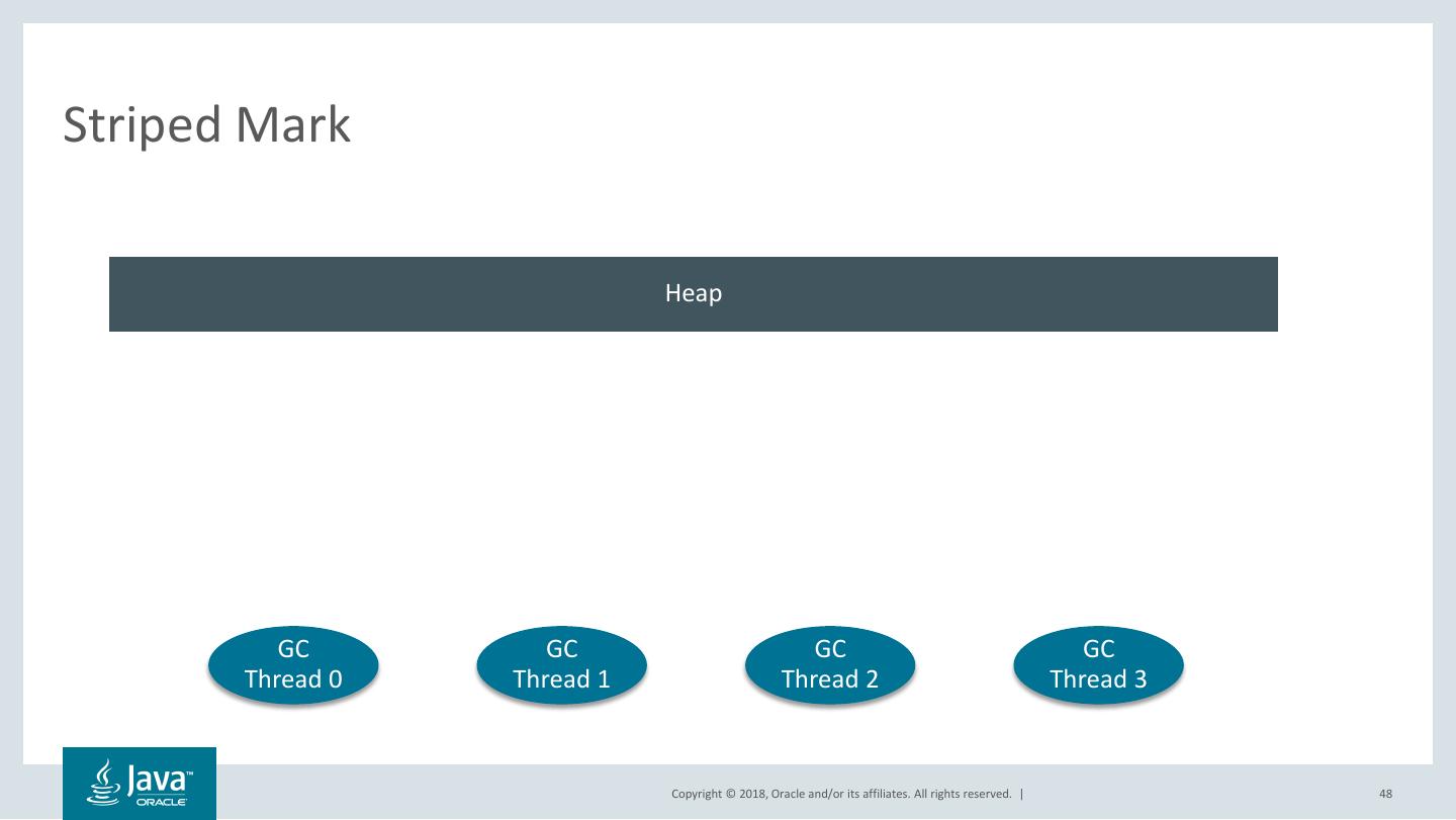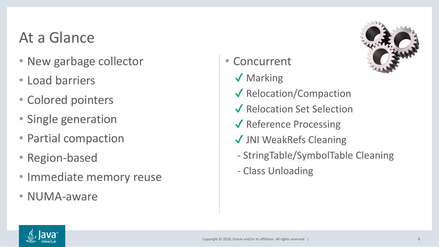 6 .Goals TB Multi-terabyte heaps 10ms Max GC pause time Lay the foundation for future GC features 15% Max application throughput reduction Copyright © 2018, Oracle and/or its affiliates. All rights reserved. | 6