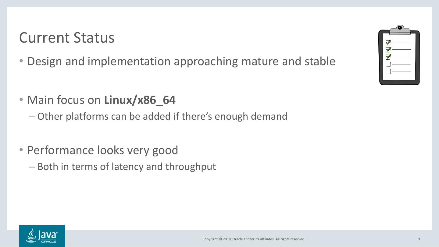 9 .Current Status • Design and implementation approaching mature and stable • Main focus on Linux/x86_64 – Other platforms can be added if there’s enough demand • Performance looks very good – Both in terms of latency and throughput Copyright © 2018, Oracle and/or its affiliates. All rights reserved. | 9