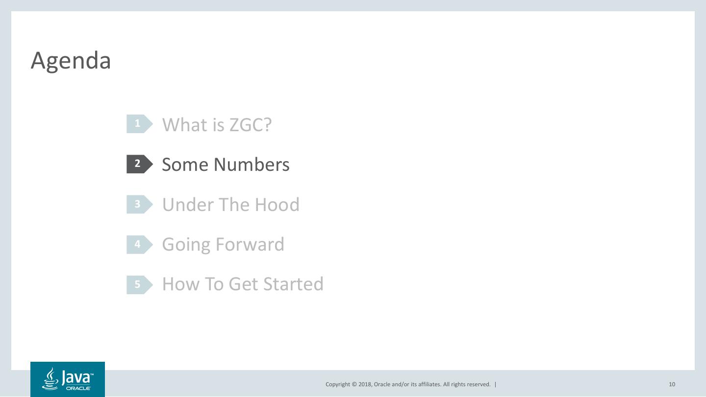 10 .Agenda 1 What is ZGC? 2 Some Numbers 3 Under The Hood 4 Going Forward 5 How To Get Started Copyright © 2018, Oracle and/or its affiliates. All rights reserved. | 10