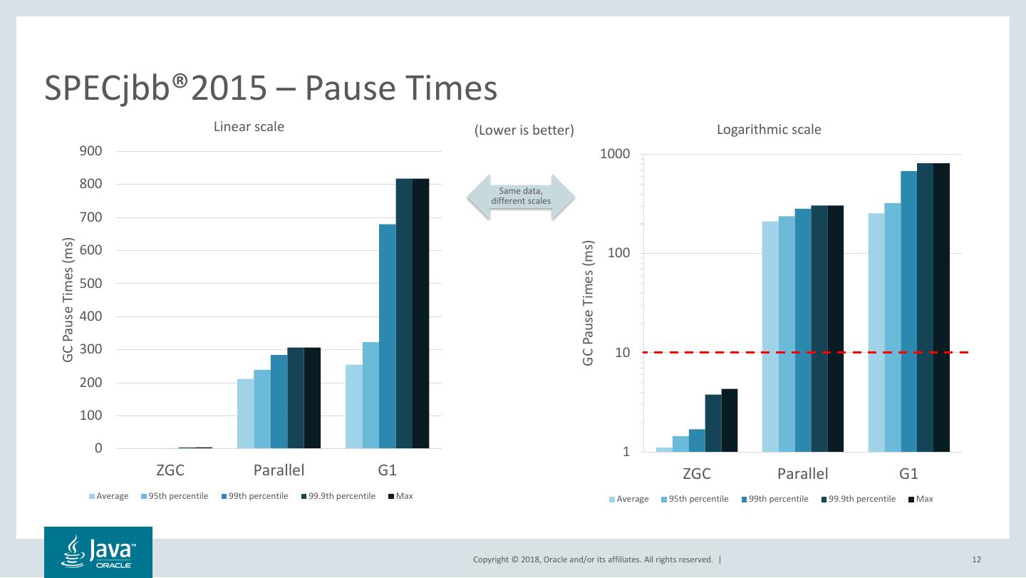 11 .SPECjbb®2015 – Score (Higher is better) Mode: Composite 100% 90% Heap Size: 128G 80% OS: Oracle Linux 7.4 70% HW: Intel Xeon E5-2690 2.9GHz 60% 2 sockets, 16 cores (32 hw-threads) 50% 40% 30% 20% 10% 0% ZGC Parallel G1 SPECjbb®2015 is a registered trademark of the Standard Performance max-JOPS (Throughput) critical-JOPS (Throughput with latency requirements) Evaluation Corporation (spec.org). The actual results are not represented as compliant because the SUT may not meet SPEC's requirements for general availability. Copyright © 2018, Oracle and/or its affiliates. All rights reserved. | 11