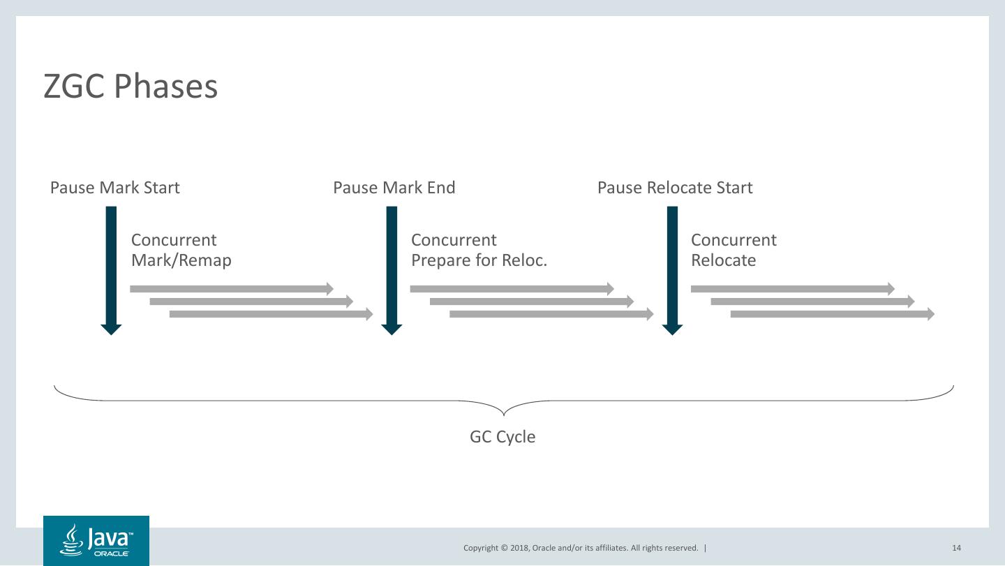 14 .ZGC Phases Pause Mark Start Pause Mark End Pause Relocate Start Concurrent Concurrent Concurrent Mark/Remap Prepare for Reloc. Relocate GC Cycle Copyright © 2018, Oracle and/or its affiliates. All rights reserved. | 14