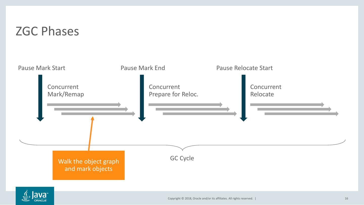 15 .ZGC Phases Pause Mark Start Pause Mark End Pause Relocate Start Concurrent Concurrent Concurrent Mark/Remap Prepare for Reloc. Relocate Mark objects GC Cycle pointed to by roots Copyright © 2018, Oracle and/or its affiliates. All rights reserved. | 15