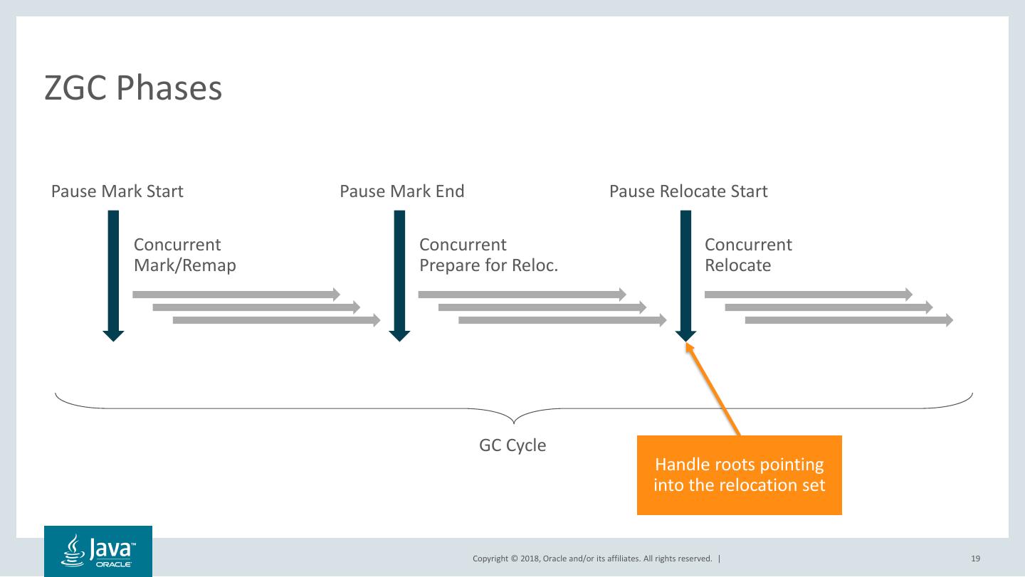 18 .ZGC Phases Pause Mark Start Pause Mark End Pause Relocate Start Concurrent Concurrent Concurrent Mark/Remap Prepare for Reloc. Relocate GC Cycle Reference processing Weak root cleaning Relocation set selection Copyright © 2018, Oracle and/or its affiliates. All rights reserved. | 18