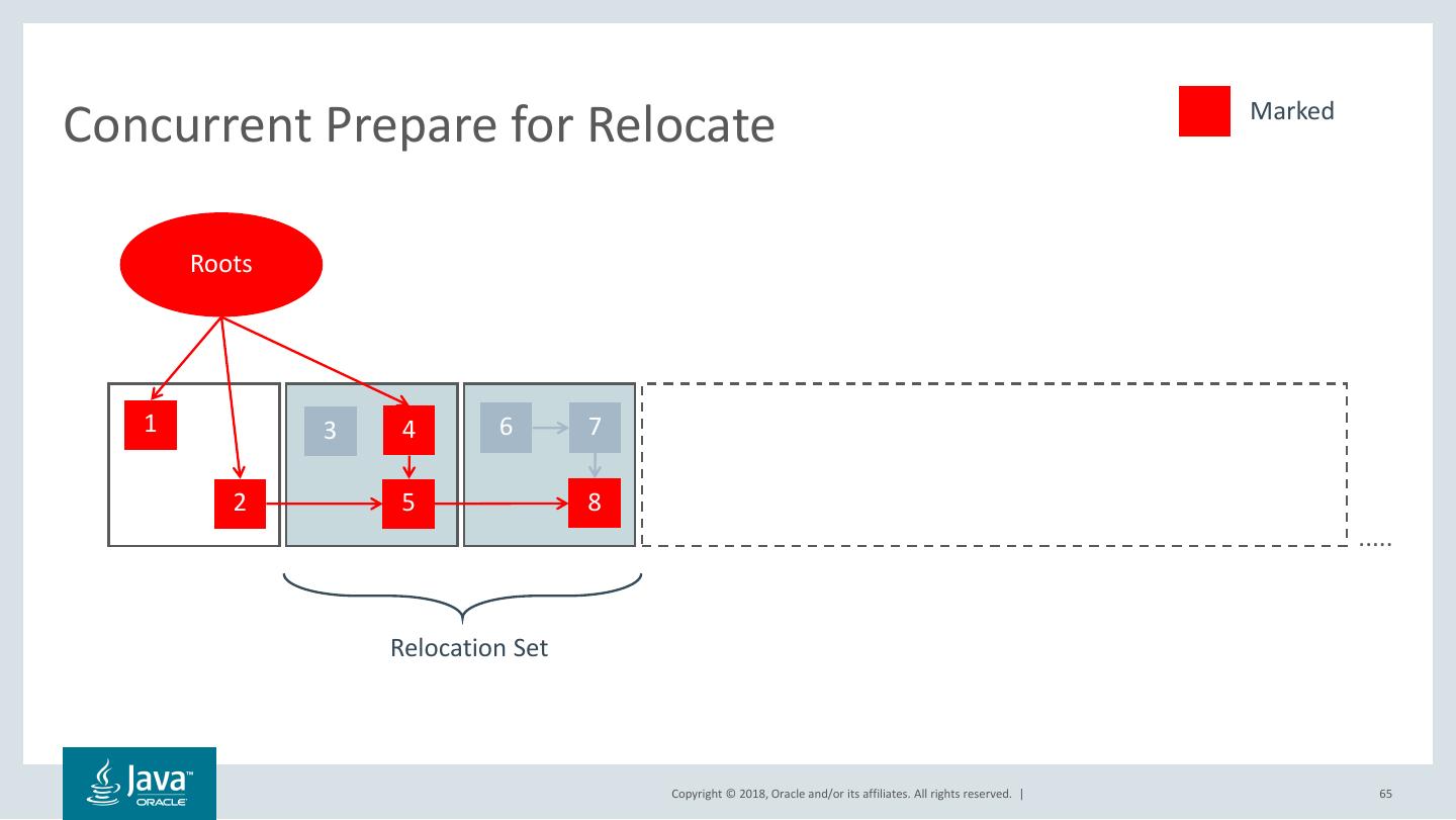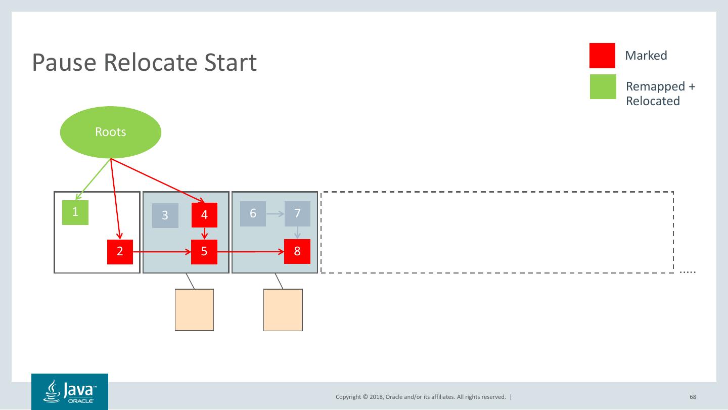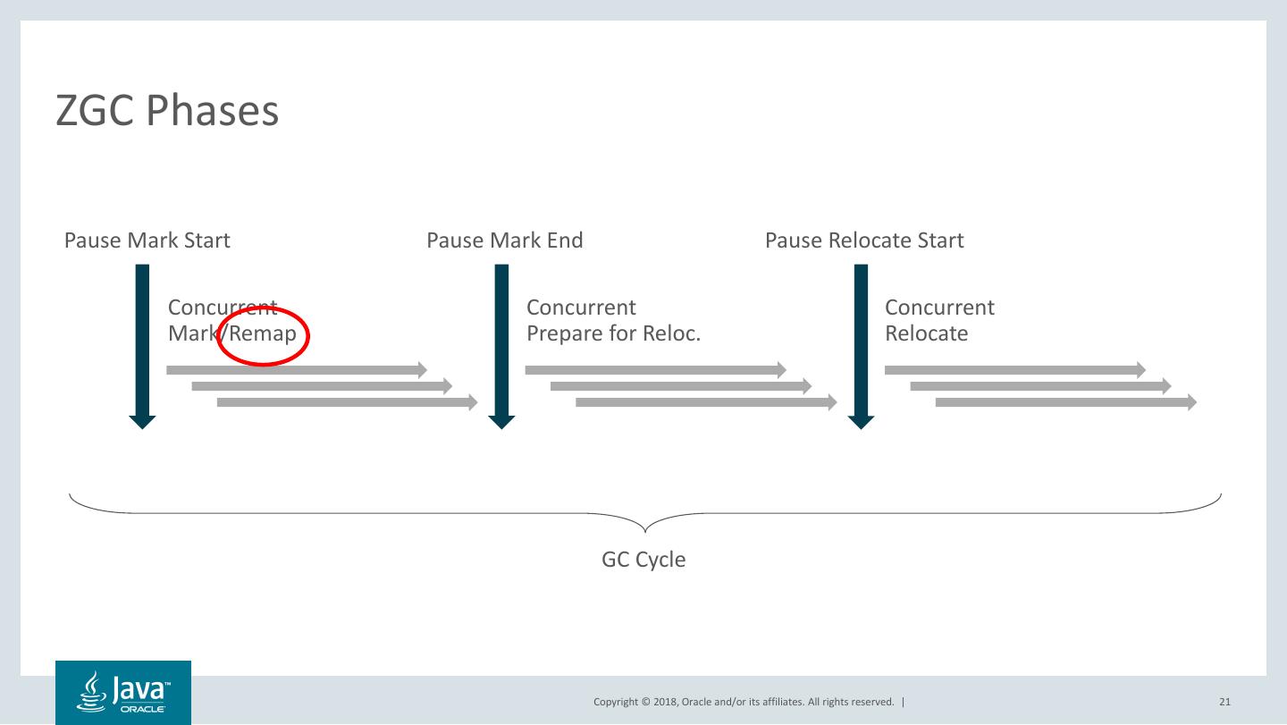20 .ZGC Phases Pause Mark Start Pause Mark End Pause Relocate Start Concurrent Concurrent Concurrent Mark/Remap Prepare for Reloc. Relocate GC Cycle Relocate objects in the relocation set Copyright © 2018, Oracle and/or its affiliates. All rights reserved. | 20