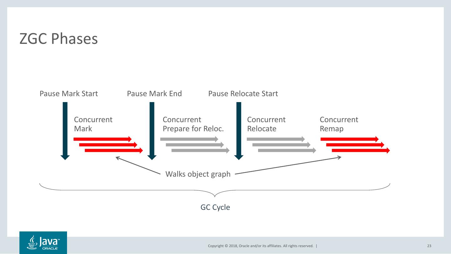 22 .ZGC Phases Pause Mark Start Pause Mark End Pause Relocate Start Concurrent Concurrent Concurrent Concurrent Mark Prepare for Reloc. Relocate Remap GC Cycle Copyright © 2018, Oracle and/or its affiliates. All rights reserved. | 22