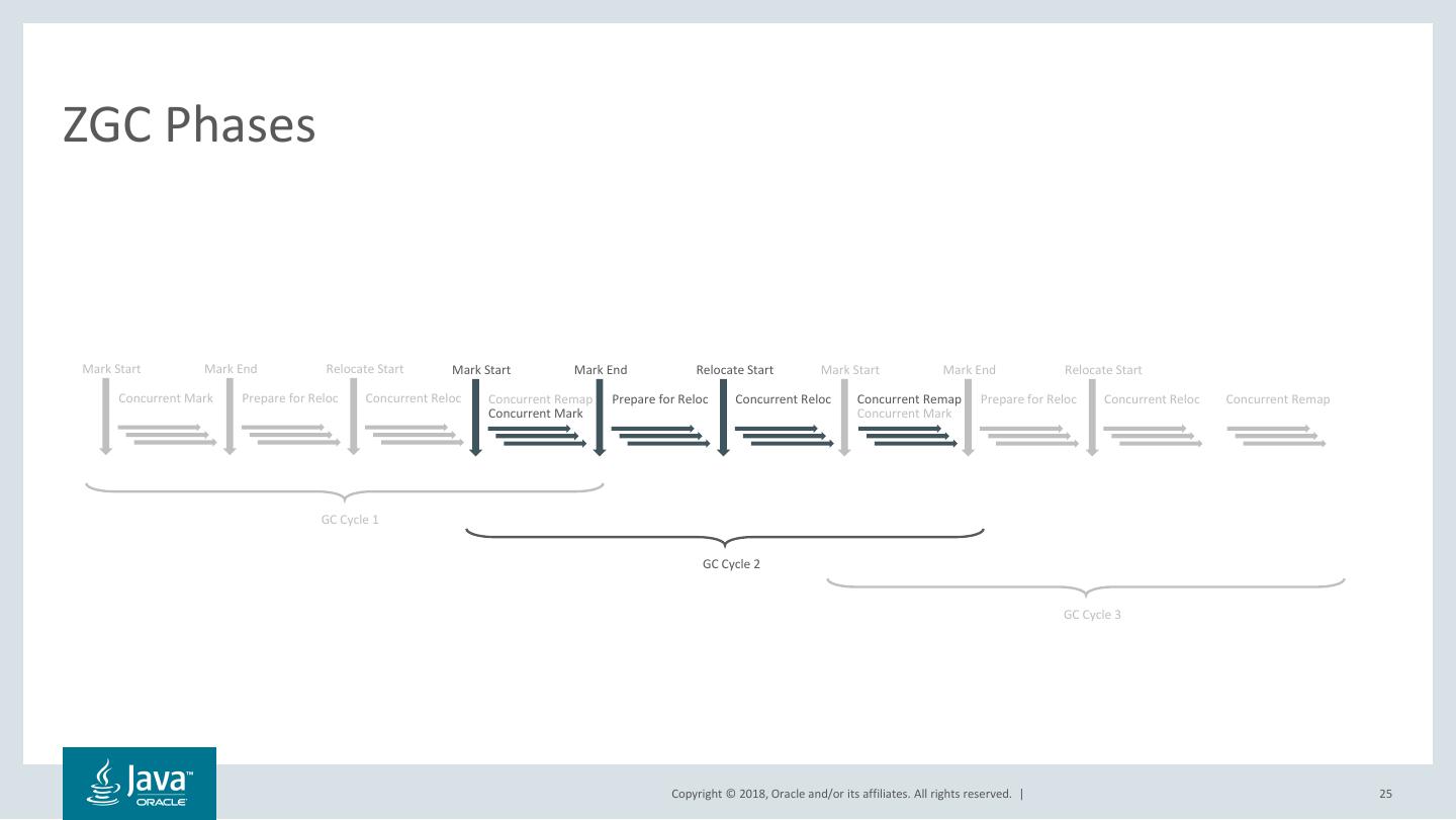 24 .ZGC Phases Pause Mark Start Pause Mark End Pause Relocate Start Concurrent Concurrent Concurrent Concurrent Mark Prepare for Reloc. Relocate Remap Walks object graph GC Cycle Copyright © 2018, Oracle and/or its affiliates. All rights reserved. | 24