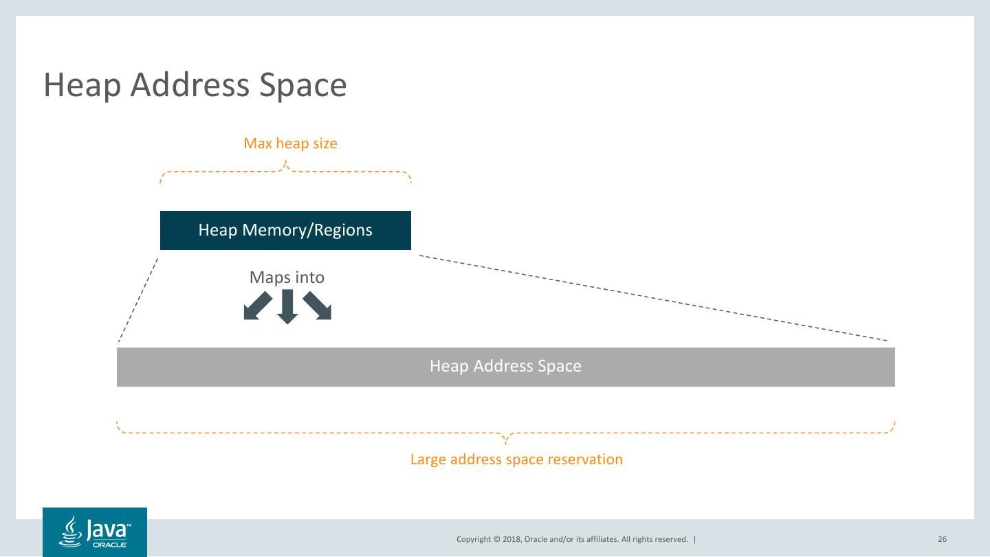 26 .Heap Address Space Max heap size Heap Memory/Regions Maps into Heap Address Space Large address space reservation Copyright © 2018, Oracle and/or its affiliates. All rights reserved. | 26