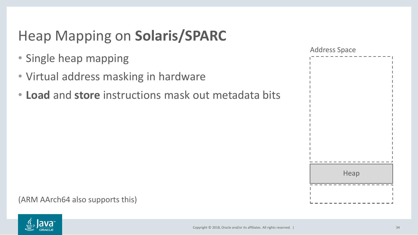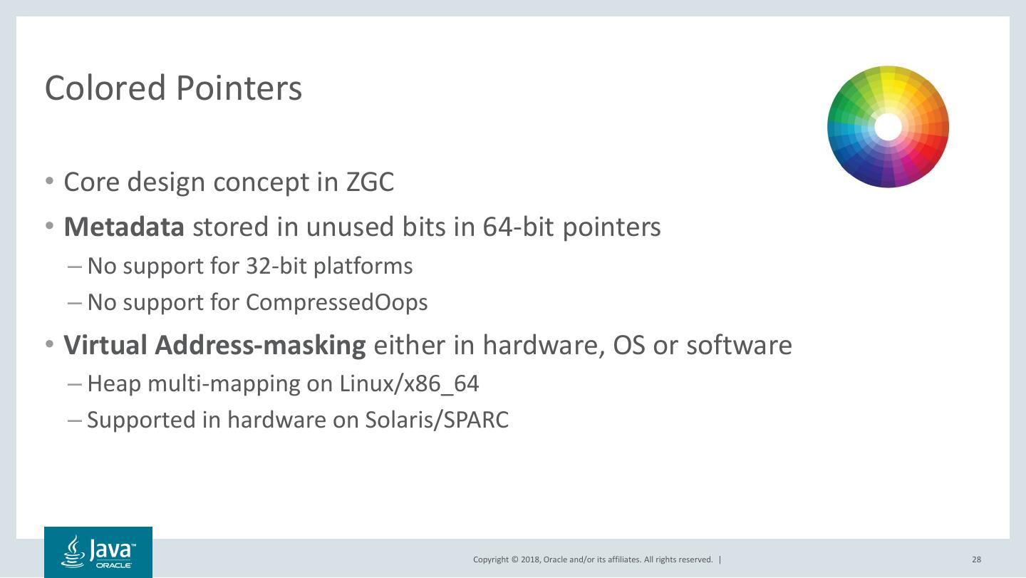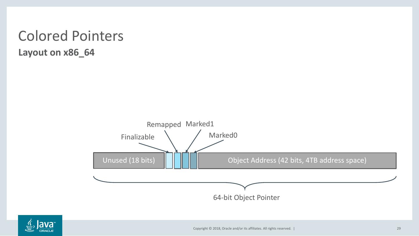28 .Colored Pointers • Core design concept in ZGC • Metadata stored in unused bits in 64-bit pointers – No support for 32-bit platforms – No support for CompressedOops • Virtual Address-masking either in hardware, OS or software – Heap multi-mapping on Linux/x86_64 – Supported in hardware on Solaris/SPARC Copyright © 2018, Oracle and/or its affiliates. All rights reserved. | 28