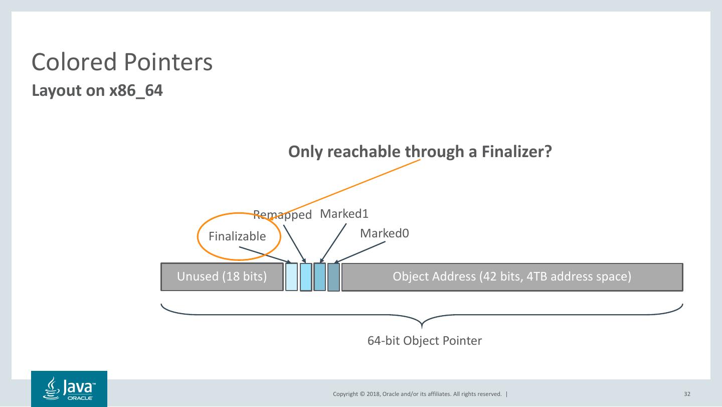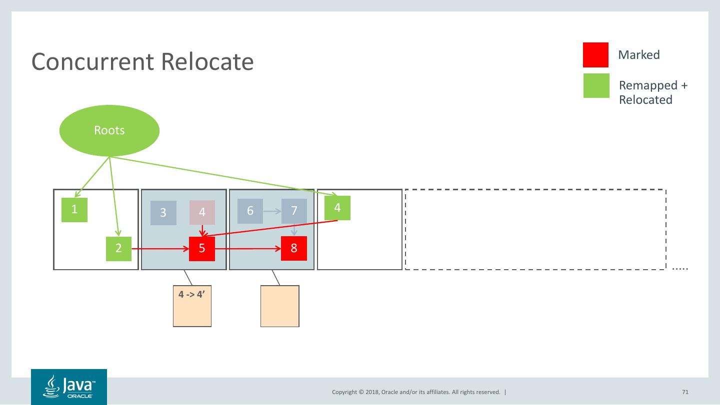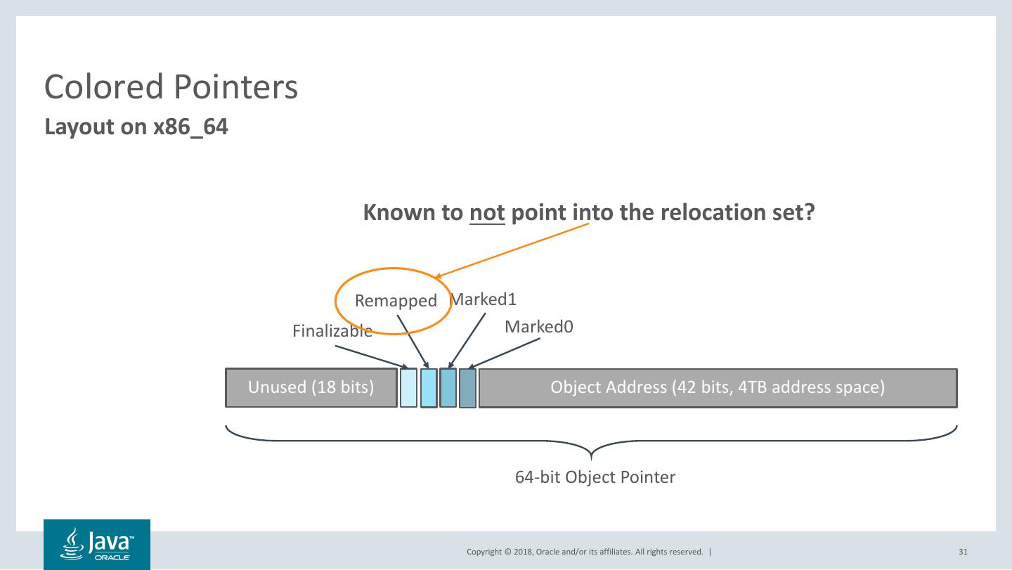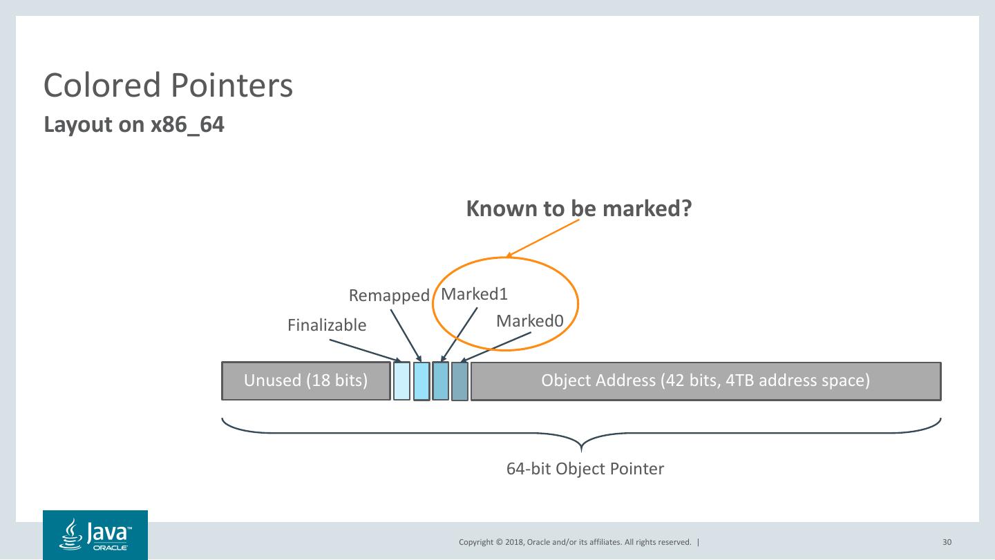 29 .Colored Pointers Layout on x86_64 Remapped Marked1 Finalizable Marked0 Unused (18 bits) Object Address (42 bits, 4TB address space) 64-bit Object Pointer Copyright © 2018, Oracle and/or its affiliates. All rights reserved. | 29
