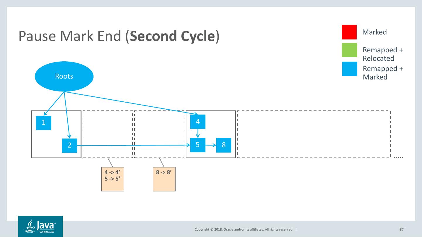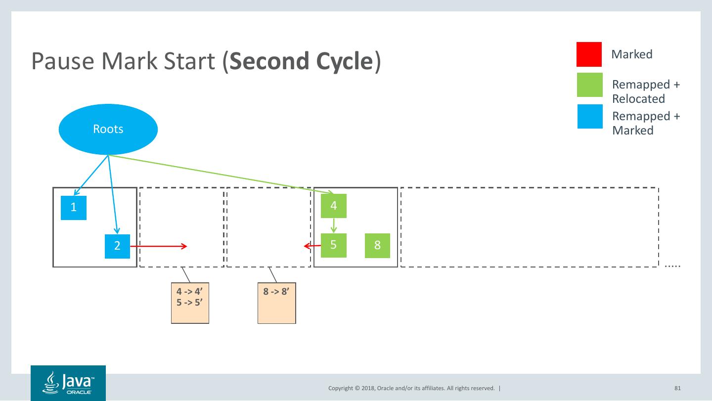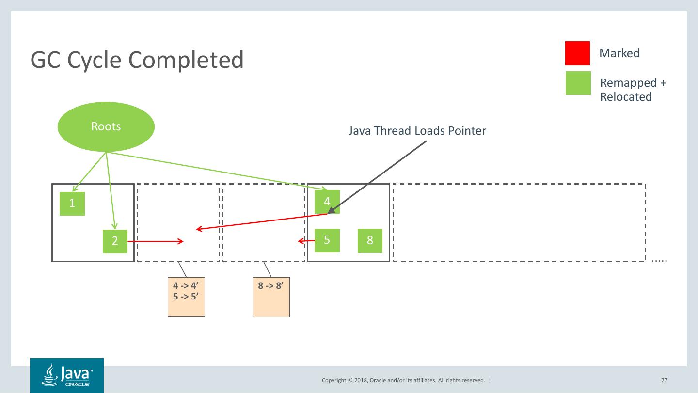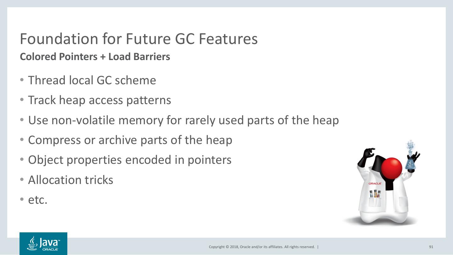 29 .Colored Pointers Layout on x86_64 Remapped Marked1 Finalizable Marked0 Unused (18 bits) Object Address (42 bits, 4TB address space) 64-bit Object Pointer Copyright © 2018, Oracle and/or its affiliates. All rights reserved. | 29