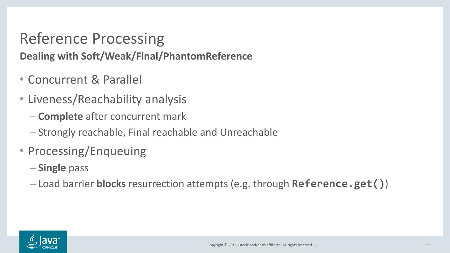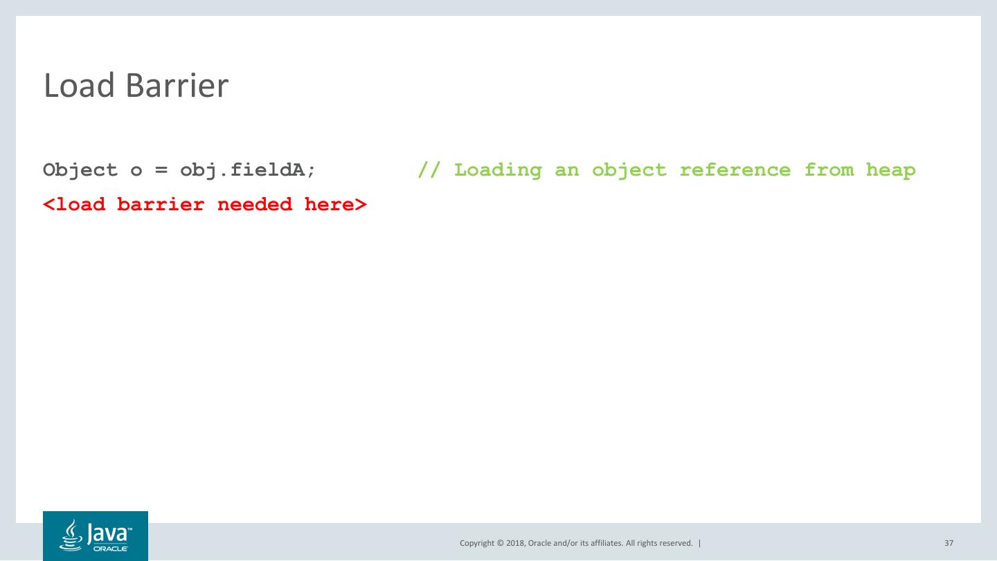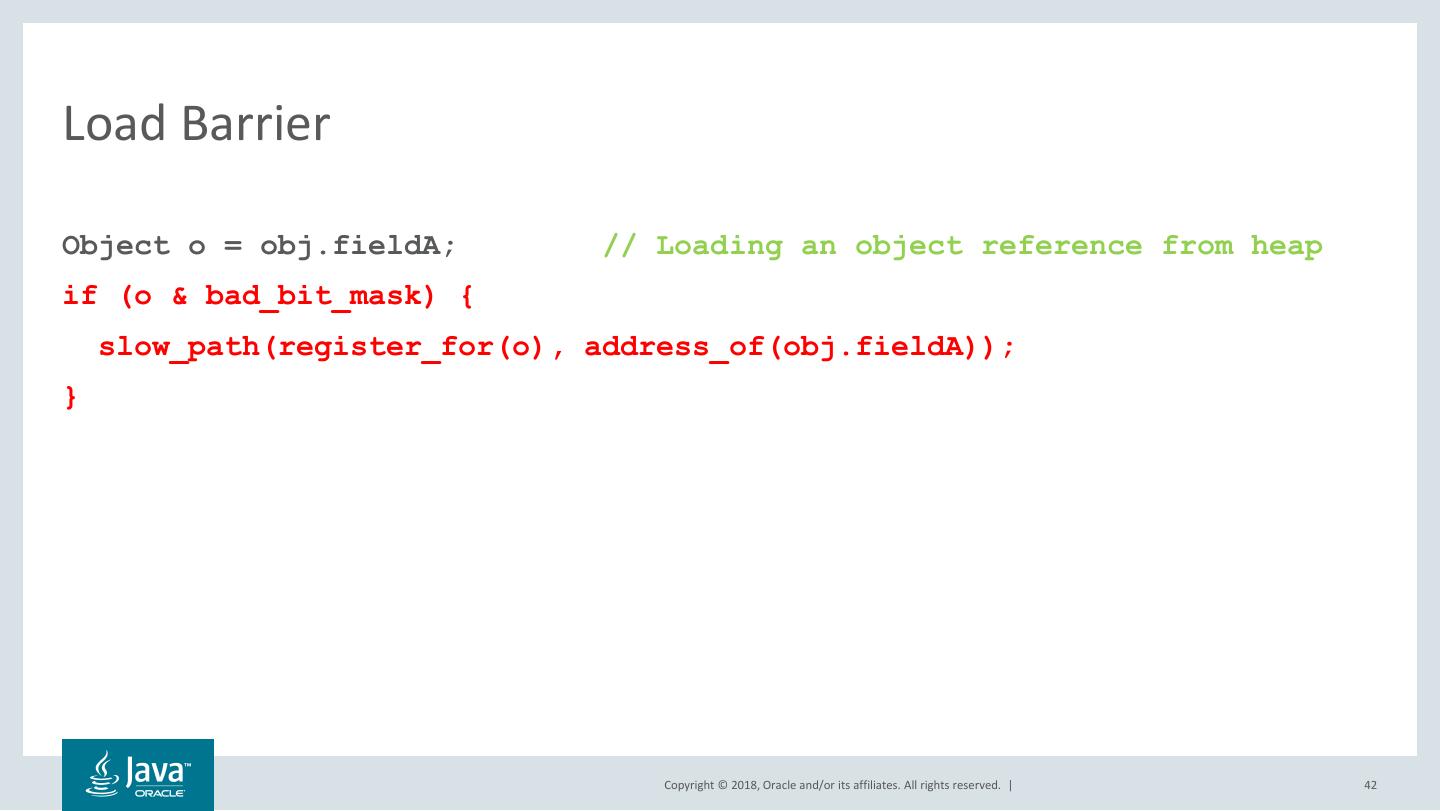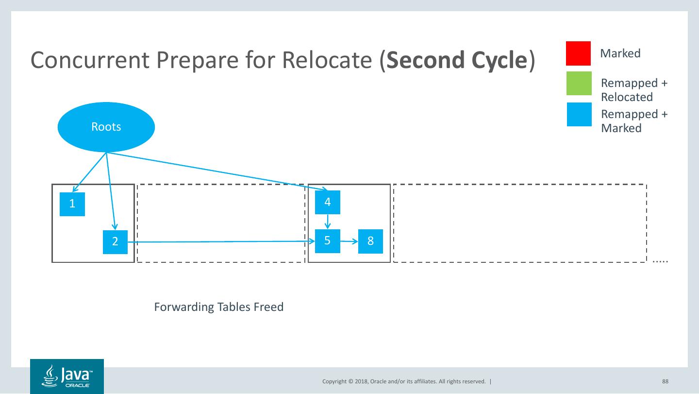 29 .Colored Pointers Layout on x86_64 Remapped Marked1 Finalizable Marked0 Unused (18 bits) Object Address (42 bits, 4TB address space) 64-bit Object Pointer Copyright © 2018, Oracle and/or its affiliates. All rights reserved. | 29