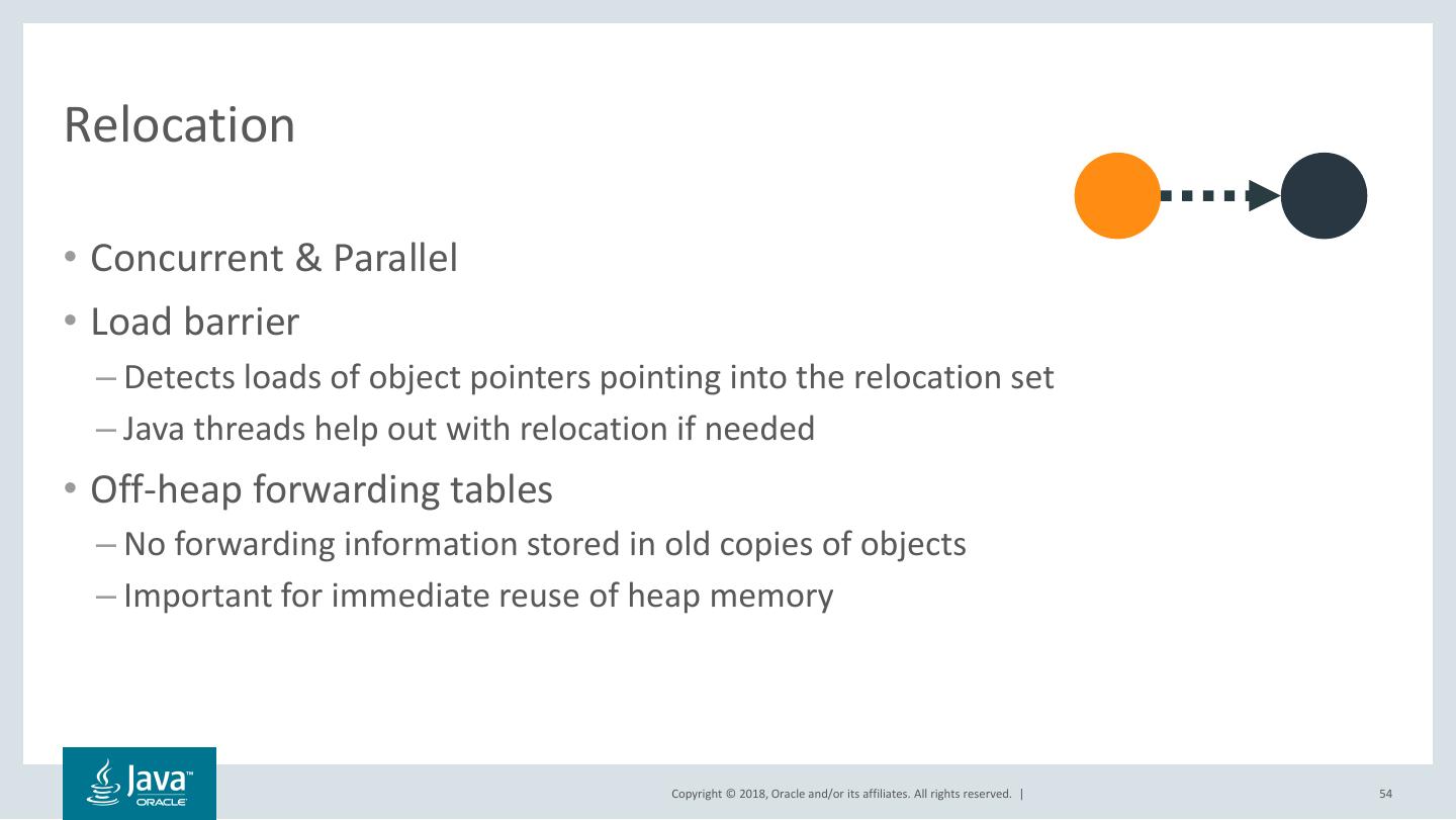 17 .ZGC Phases Pause Mark Start Pause Mark End Pause Relocate Start Concurrent Concurrent Concurrent Mark/Remap Prepare for Reloc. Relocate GC Cycle Synchronization point (Weak roots cleaning) Copyright © 2018, Oracle and/or its affiliates. All rights reserved. | 17