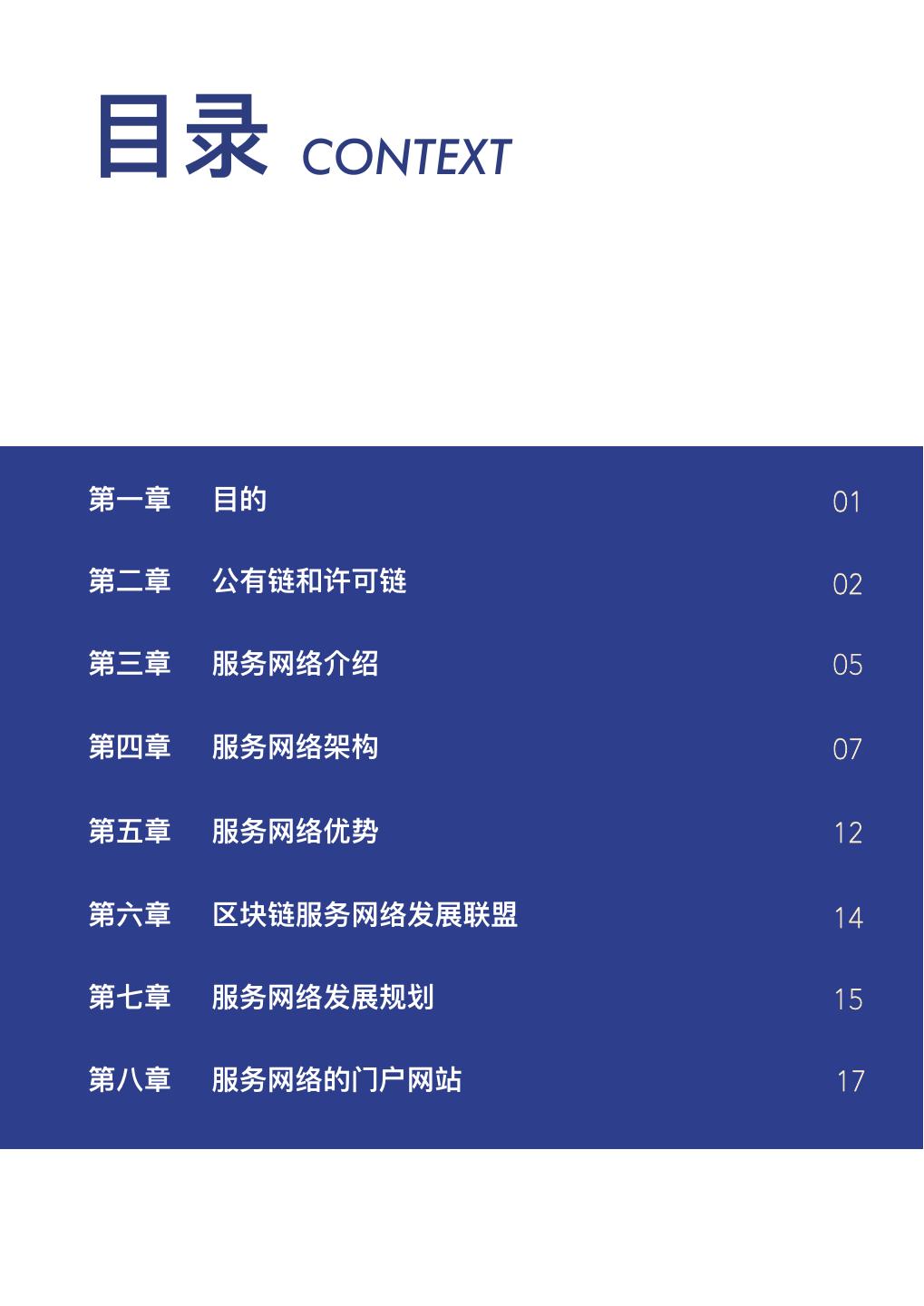 3 .目录 CONTEXT 第一章 目的 01 第二章 公有链和许可链 02 第三章 服务网络介绍 05 第四章 服务网络架构 07 第五章 服务网络优势 12 第六章 区块链服务网络发展联盟 14 第七章 服务网络发展规划 15 第八章 服务网络的门户网站 17