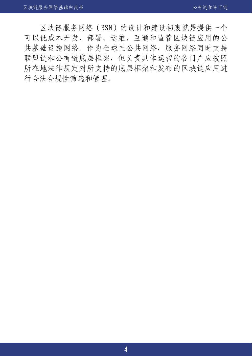 8 .区块链服务网络基础白皮书 公有链和许可链 服务区块链服务网络(BSN)的设计和建设初衷就是提供一个 可以低成本开发、部署、运维、互通和监管区块链应用的公 共基础设施网络。作为全球性公共网络,服务网络同时支持 联盟链和公有链底层框架,但负责具体运营的各门户应按照 所在地法律规定对所支持的底层框架和发布的区块链应用进 行合法合规性筛选和管理。 4