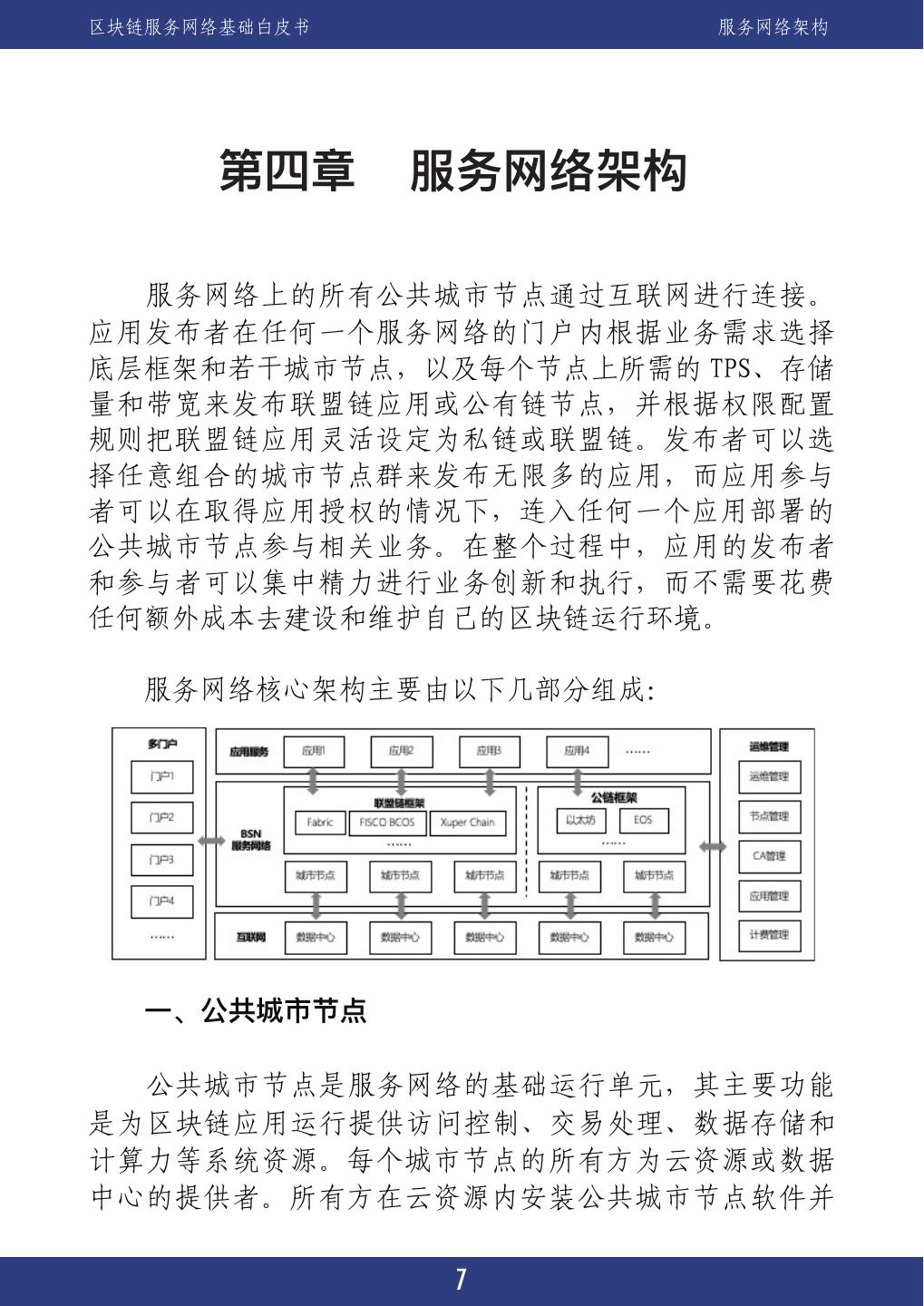 11 .区块链服务网络基础白皮书 服务网络架构 第四章 服务网络架构 服务服务网络上的所有公共城市节点通过互联网进行连接。 应用发布者在任何一个服务网络的门户内根据业务需求选择 底层框架和若干城市节点,以及每个节点上所需的 TPS、存储 量和带宽来发布联盟链应用或公有链节点,并根据权限配置 规则把联盟链应用灵活设定为私链或联盟链。发布者可以选 择任意组合的城市节点群来发布无限多的应用,而应用参与 者可以在取得应用授权的情况下,连入任何一个应用部署的 公共城市节点参与相关业务。在整个过程中,应用的发布者 和参与者可以集中精力进行业务创新和执行,而不需要花费 任何额外成本去建设和维护自己的区块链运行环境。 服务服务网络核心架构主要由以下几部分组成: 服务一、公共城市节点 服务公共城市节点是服务网络的基础运行单元,其主要功能 是为区块链应用运行提供访问控制、交易处理、数据存储和 计算力等系统资源。每个城市节点的所有方为云资源或数据 中心的提供者。所有方在云资源内安装公共城市节点软件并 7